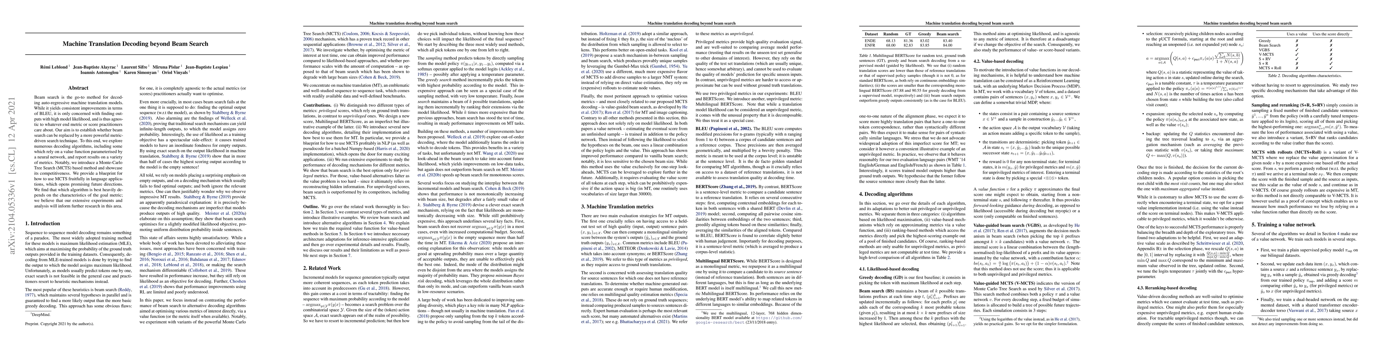 This paper explores alternative decoding methods to beam search for machine translation, focusing on metric-driven techniques that prioritize end-user metrics over model likelihood. The study introduces a Monte-Carlo Tree Search (MCTS) method and demonstrates its competitiveness, providing a framework for future research in language applications.