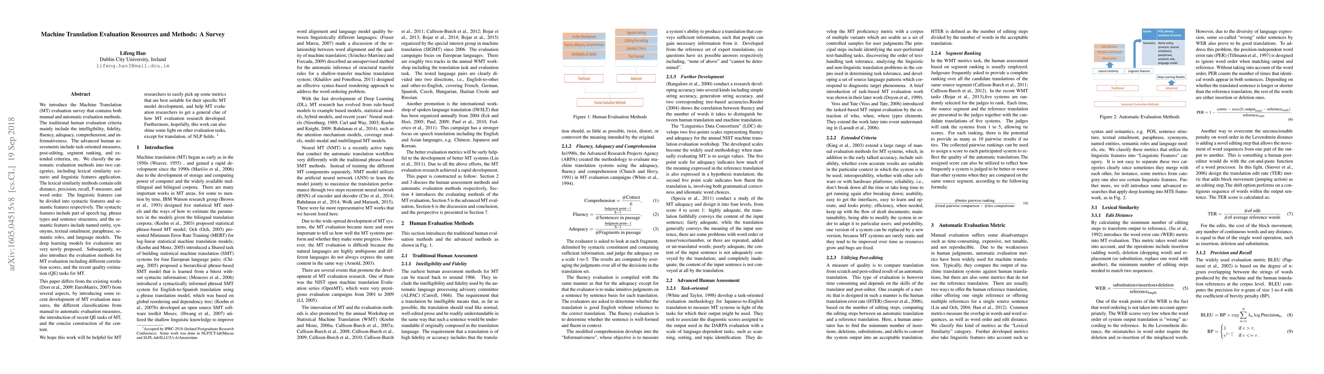 We introduce the Machine Translation (MT) evaluation survey that contains both manual and automatic evaluation methods. The traditional human evaluation criteria mainly include the intelligibility, fidelity, fluency, adequacy, comprehension, and informativeness. The advanced human assessments include task-oriented measures, post-editing, segment ranking, and extended criteriea, etc. We classify the automatic evaluation methods into two categories, including lexical similarity scenario and linguistic features application. The lexical similarity methods contain edit distance, precision, recall, F-measure, and word order. The linguistic features can be divided into syntactic features and semantic features respectively. The syntactic features include part of speech tag, phrase types and sentence structures, and the semantic features include named entity, synonyms, textual entailment, paraphrase, semantic roles, and language models. The deep learning models for evaluation are very newly proposed. Subsequently, we also introduce the evaluation methods for MT evaluation including different correlation scores, and the recent quality estimation (QE) tasks for MT. This paper differs from the existing works \cite{GALEprogram2009,EuroMatrixProject2007} from several aspects, by introducing some recent development of MT evaluation measures, the different classifications from manual to automatic evaluation measures, the introduction of recent QE tasks of MT, and the concise construction of the content. We hope this work will be helpful for MT researchers to easily pick up some metrics that are best suitable for their specific MT model development, and help MT evaluation researchers to get a general clue of how MT evaluation research developed. Furthermore, hopefully, this work can also shine some light on other evaluation tasks, except for translation, of NLP fields.