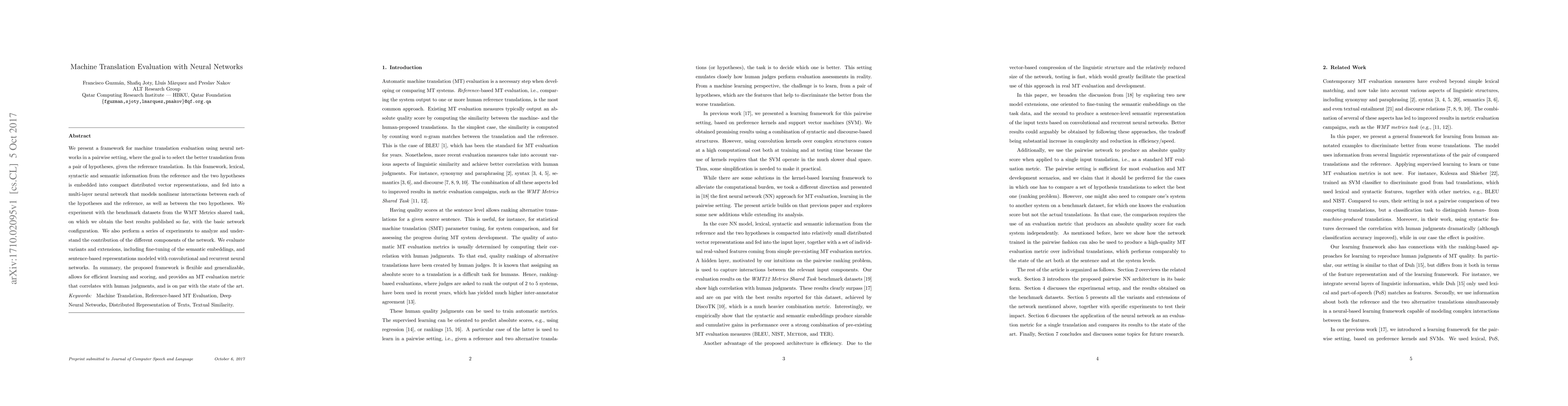 This paper proposes a neural network framework for evaluating machine translation by comparing pairs of translations against a reference. The framework embeds lexical, syntactic, and semantic information into vector representations, which are processed by a multi-layer neural network to model interactions, achieving state-of-the-art results on benchmark datasets.