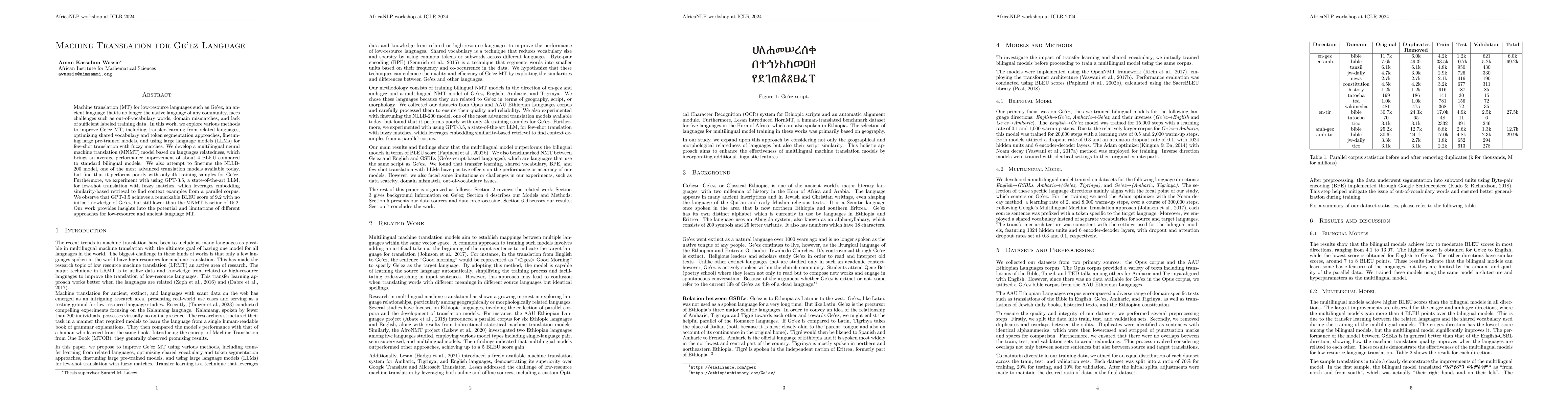 This research explores machine translation methods for the low-resource Ge'ez language, highlighting improvements through transfer learning and MNMT models, which achieve a 4 BLEU increase. Finetuning advanced models like NLLB-200 proves ineffective with limited data, while GPT-3.5 shows potential in few-shot translation with a BLEU score of 9.2, though it lags behind the MNMT baseline.
