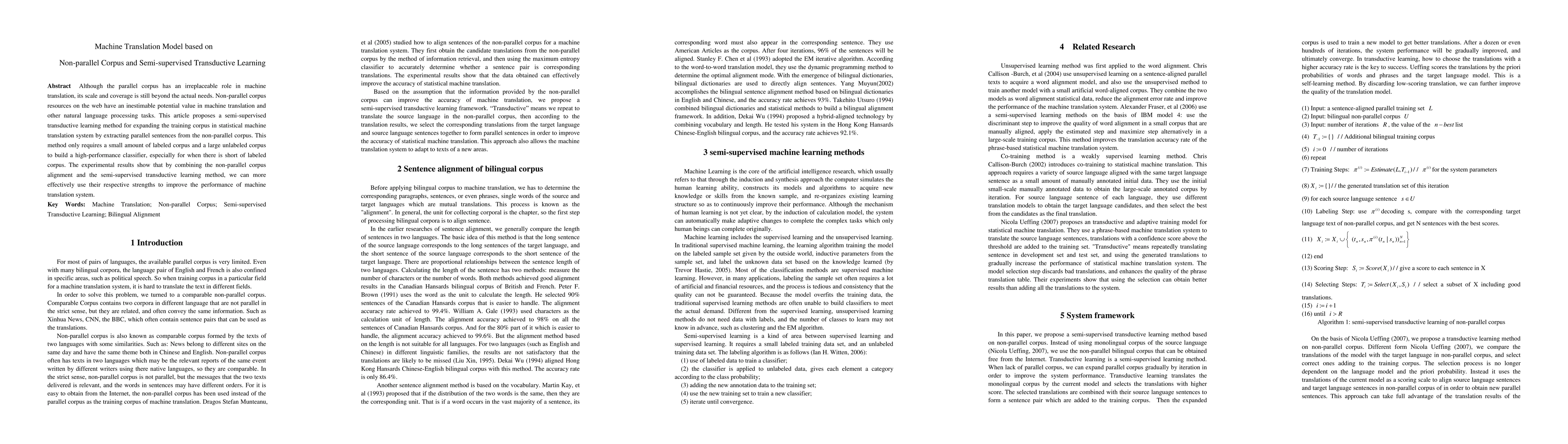 This paper proposes a semi-supervised transductive learning method to enhance machine translation using non-parallel web corpus. It demonstrates improved translation performance by leveraging both a small labeled corpus and a large unlabeled corpus, effectively addressing the scarcity of labeled data.