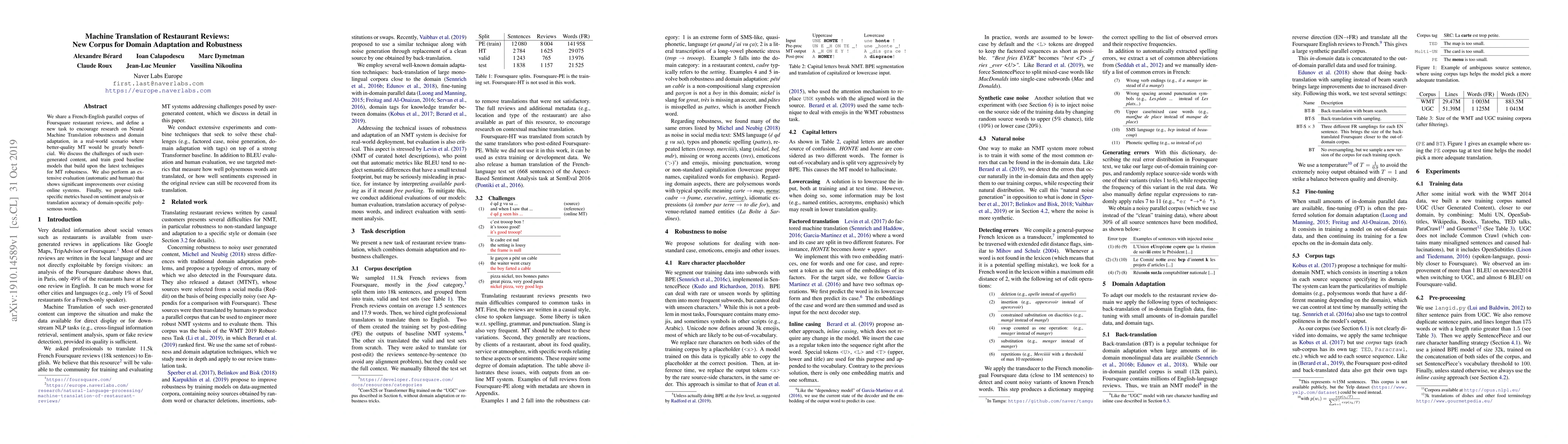 This paper introduces a French-English parallel corpus of Foursquare restaurant reviews to promote research on neural machine translation robustness and domain adaptation. The authors provide baseline models using modern MT techniques and propose new task-specific metrics for evaluation, demonstrating significant improvements over existing systems.