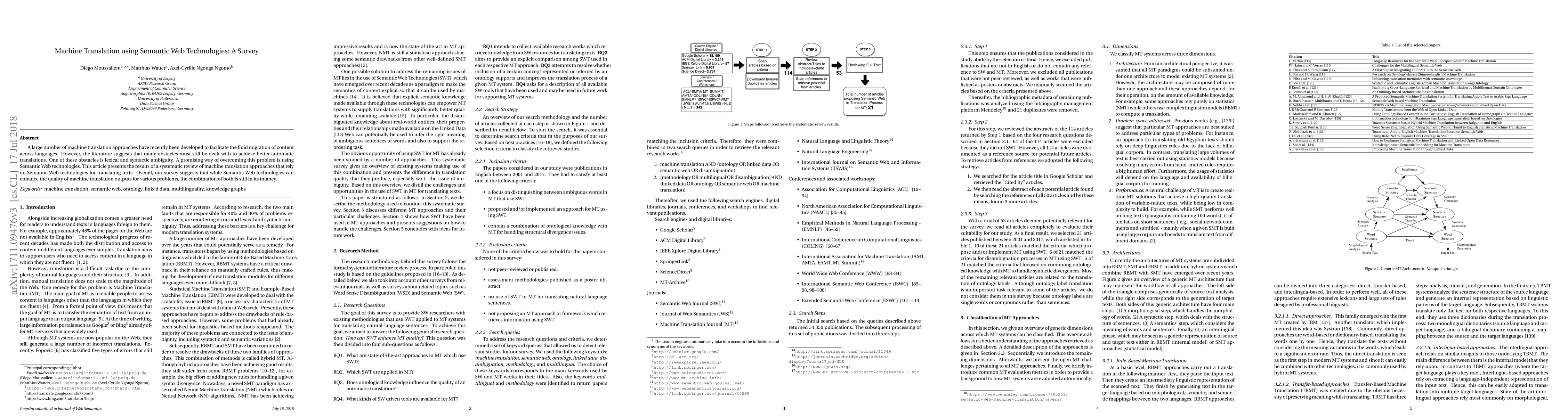 This paper surveys machine translation methods leveraging Semantic Web technologies to address lexical and syntactic ambiguity, indicating that while such approaches can improve translation quality, their integration remains in its early stages.