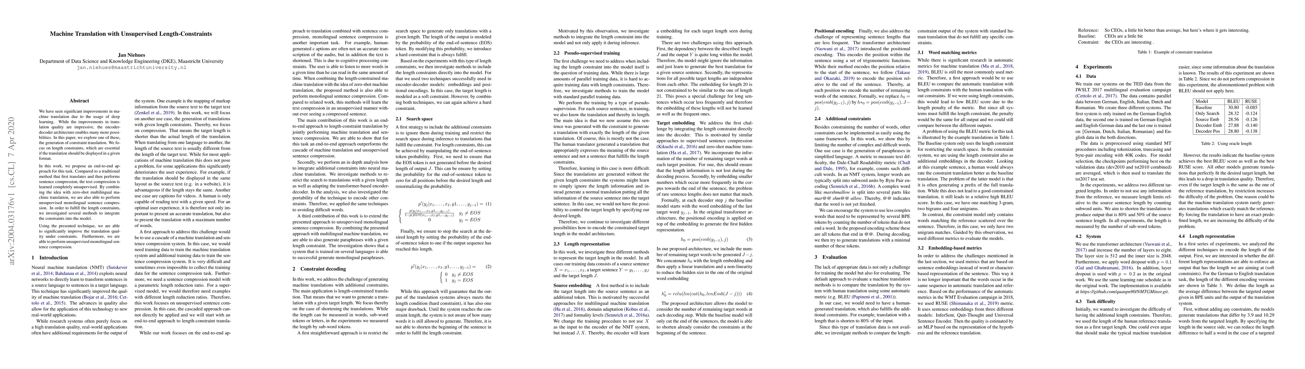 We have seen significant improvements in machine translation due to the usage of deep learning. While the improvements in translation quality are impressive, the encoder-decoder architecture enables many more possibilities. In this paper, we explore one of these, the generation of constraint translation. We focus on length constraints, which are essential if the translation should be displayed in a given format. In this work, we propose an end-to-end approach for this task. Compared to a traditional method that first translates and then performs sentence compression, the text compression is learned completely unsupervised. By combining the idea with zero-shot multilingual machine translation, we are also able to perform unsupervised monolingual sentence compression. In order to fulfill the length constraints, we investigated several methods to integrate the constraints into the model. Using the presented technique, we are able to significantly improve the translation quality under constraints. Furthermore, we are able to perform unsupervised monolingual sentence compression.
