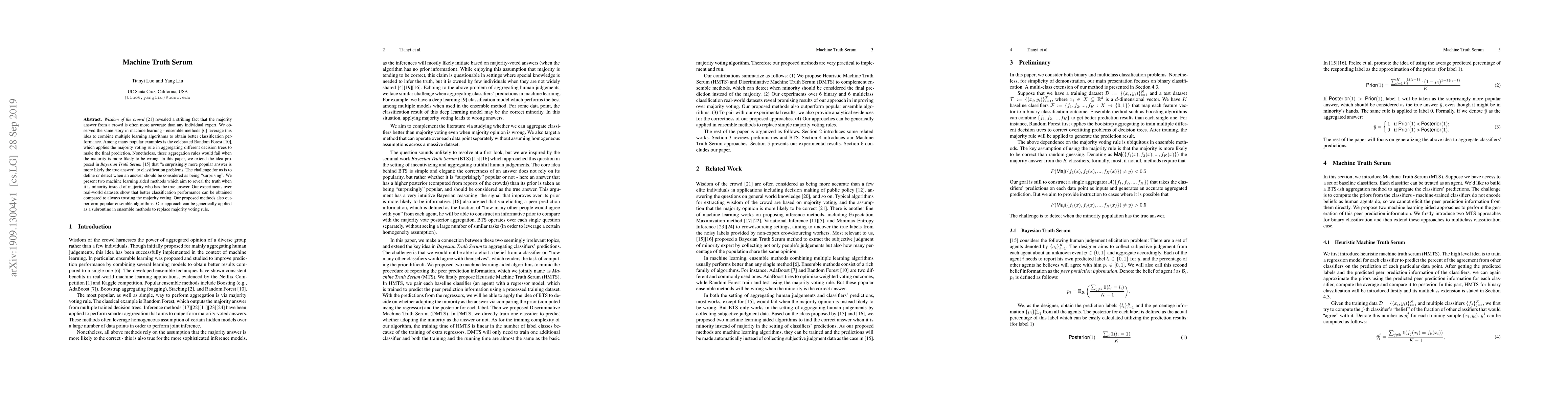 Wisdom of the crowd revealed a striking fact that the majority answer from a crowd is often more accurate than any individual expert. We observed the same story in machine learning--ensemble methods leverage this idea to combine multiple learning algorithms to obtain better classification performance. Among many popular examples is the celebrated Random Forest, which applies the majority voting rule in aggregating different decision trees to make the final prediction. Nonetheless, these aggregation rules would fail when the majority is more likely to be wrong. In this paper, we extend the idea proposed in Bayesian Truth Serum that "a surprisingly more popular answer is more likely the true answer" to classification problems. The challenge for us is to define or detect when an answer should be considered as being "surprising". We present two machine learning aided methods which aim to reveal the truth when it is minority instead of majority who has the true answer. Our experiments over real-world datasets show that better classification performance can be obtained compared to always trusting the majority voting. Our proposed methods also outperform popular ensemble algorithms. Our approach can be generically applied as a subroutine in ensemble methods to replace majority voting rule.
