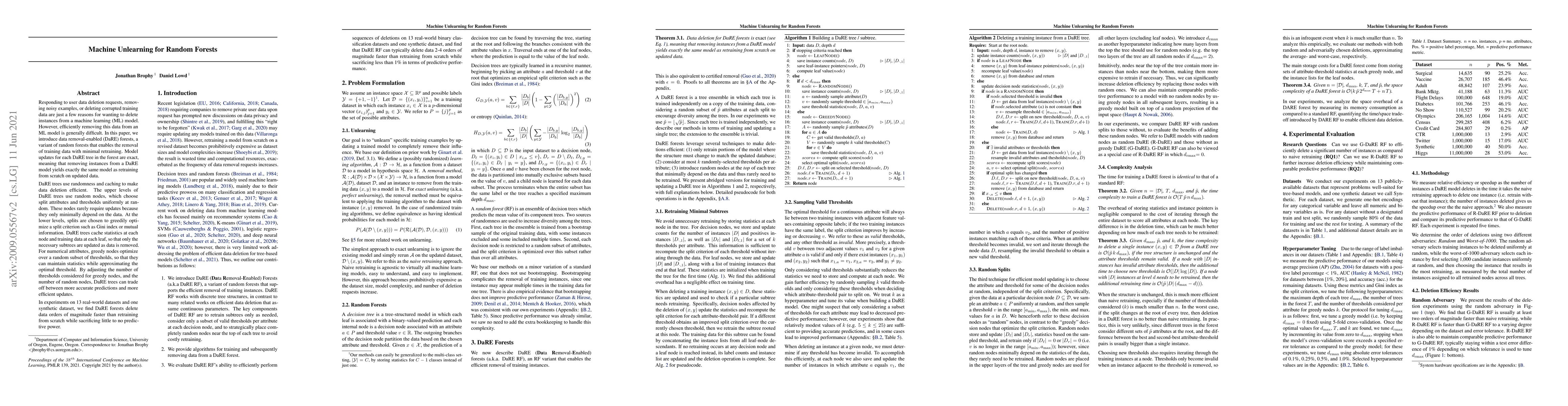 This paper introduces data removal-enabled (DaRE) forests, a variant of random forests that efficiently removes training data with minimal retraining, achieving performance comparable to full retraining.
