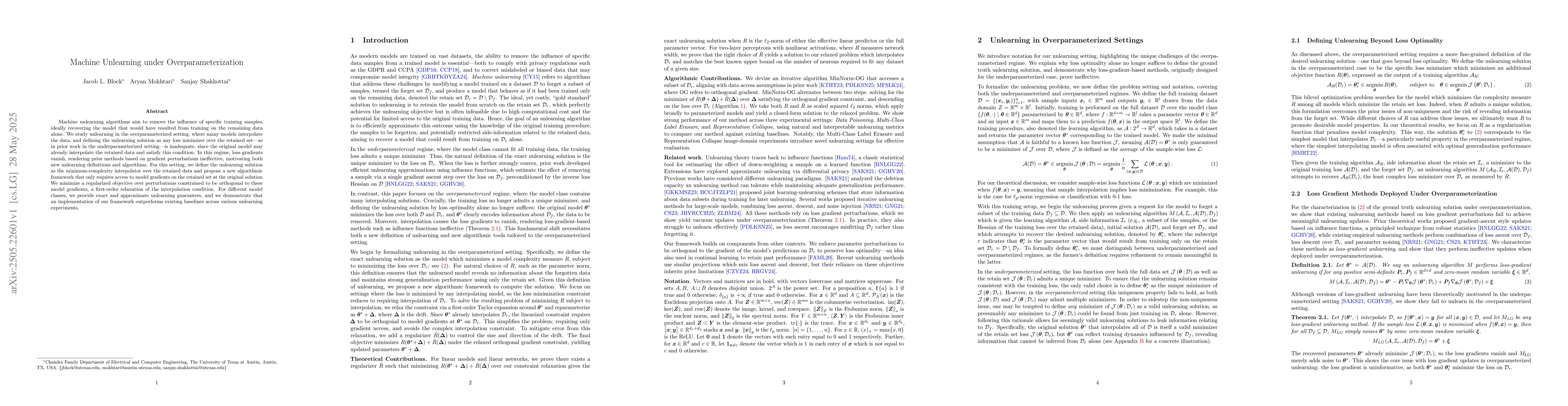 This paper introduces a new framework for machine unlearning in overparameterized settings, proposing an algorithm that minimizes a regularized objective to remove the influence of specific training samples. The approach provides exact and approximate unlearning guarantees for different model classes.