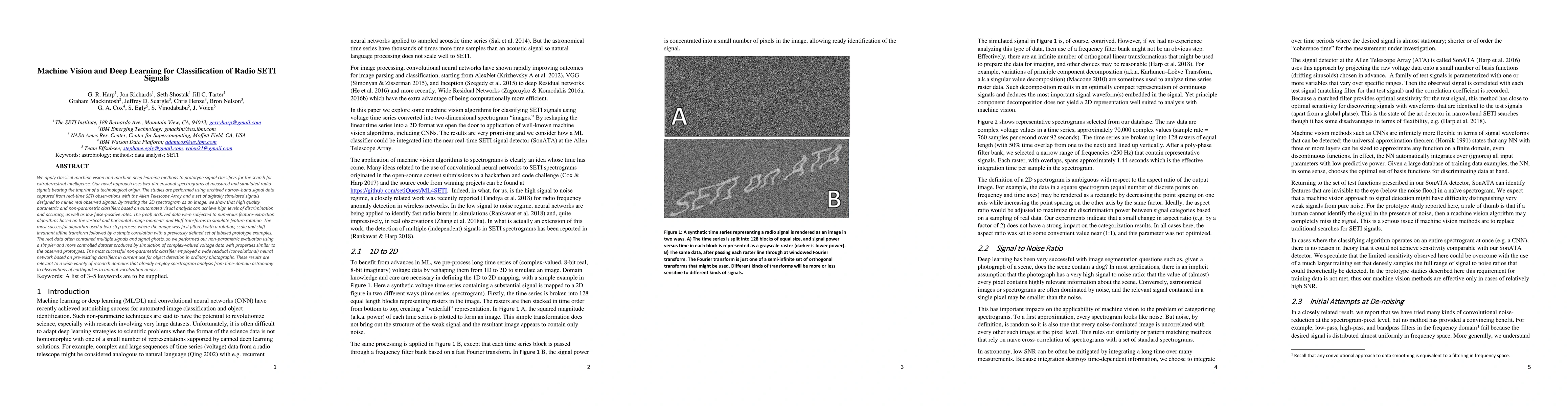 This paper explores the use of machine vision and deep learning techniques to classify radio signals for the search for extraterrestrial intelligence (SETI). By treating spectrograms as images, the study demonstrates high accuracy and low false-positive rates using both parametric and non-parametric classifiers, including convolutional neural networks.