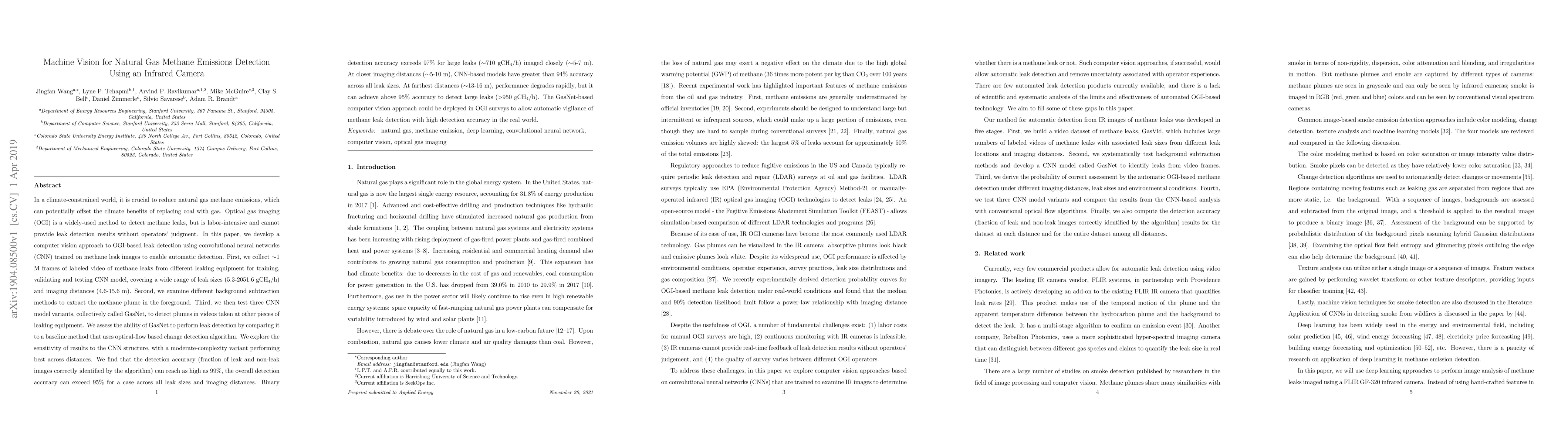 It is crucial to reduce natural gas methane emissions, which can potentially offset the climate benefits of replacing coal with gas. Optical gas imaging (OGI) is a widely-used method to detect methane leaks, but is labor-intensive and cannot provide leak detection results without operators' judgment. In this paper, we develop a computer vision approach to OGI-based leak detection using convolutional neural networks (CNN) trained on methane leak images to enable automatic detection. First, we collect ~1 M frames of labeled video of methane leaks from different leaking equipment for building CNN model, covering a wide range of leak sizes (5.3-2051.6 gCH4/h) and imaging distances (4.6-15.6 m). Second, we examine different background subtraction methods to extract the methane plume in the foreground. Third, we then test three CNN model variants, collectively called GasNet, to detect plumes in videos taken at other pieces of leaking equipment. We assess the ability of GasNet to perform leak detection by comparing it to a baseline method that uses optical-flow based change detection algorithm. We explore the sensitivity of results to the CNN structure, with a moderate-complexity variant performing best across distances. We find that the detection accuracy can reach as high as 99%, the overall detection accuracy can exceed 95% for a case across all leak sizes and imaging distances. Binary detection accuracy exceeds 97% for large leaks (~710 gCH4/h) imaged closely (~5-7 m). At closer imaging distances (~5-10 m), CNN-based models have greater than 94% accuracy across all leak sizes. At farthest distances (~13-16 m), performance degrades rapidly, but it can achieve above 95% accuracy to detect large leaks (>950 gCH4/h). The GasNet-based computer vision approach could be deployed in OGI surveys to allow automatic vigilance of methane leak detection with high detection accuracy in the real world.