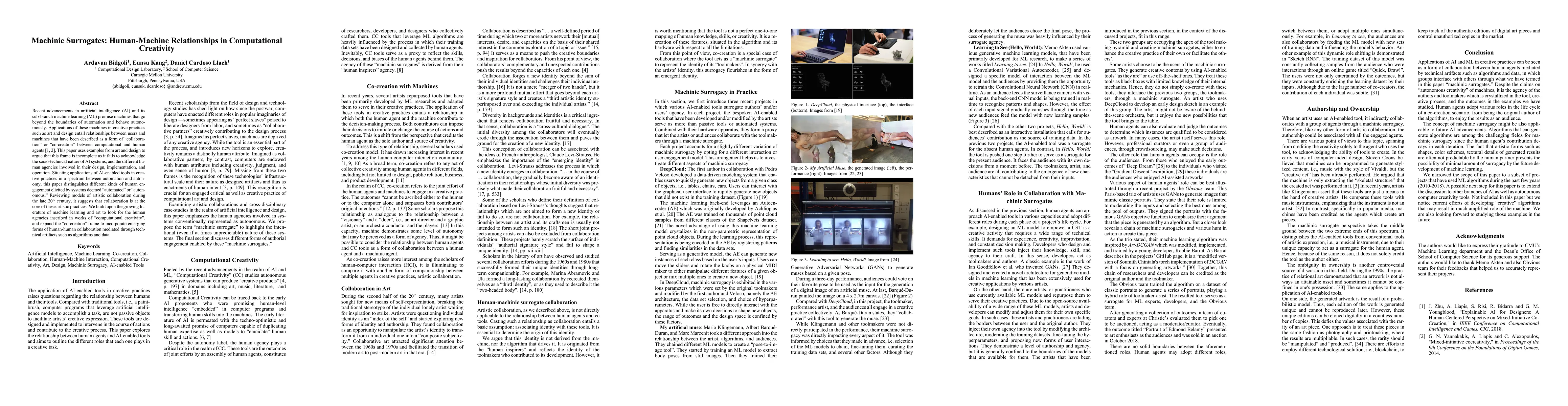Recent advancements in artificial intelligence (AI) and its sub-branch machine learning (ML) promise machines that go beyond the boundaries of automation and behave autonomously. Applications of these machines in creative practices such as art and design entail relationships between users and machines that have been described as a form of collaboration or co-creation between computational and human agents. This paper uses examples from art and design to argue that this frame is incomplete as it fails to acknowledge the socio-technical nature of AI systems, and the different human agencies involved in their design, implementation, and operation. Situating applications of AI-enabled tools in creative practices in a spectrum between automation and autonomy, this paper distinguishes different kinds of human engagement elicited by systems deemed automated or autonomous. Reviewing models of artistic collaboration during the late 20th century, it suggests that collaboration is at the core of these artistic practices. We build upon the growing literature of machine learning and art to look for the human agencies inscribed in works of computational creativity, and expand the co-creation frame to incorporate emerging forms of human-human collaboration mediated through technical artifacts such as algorithms and data.