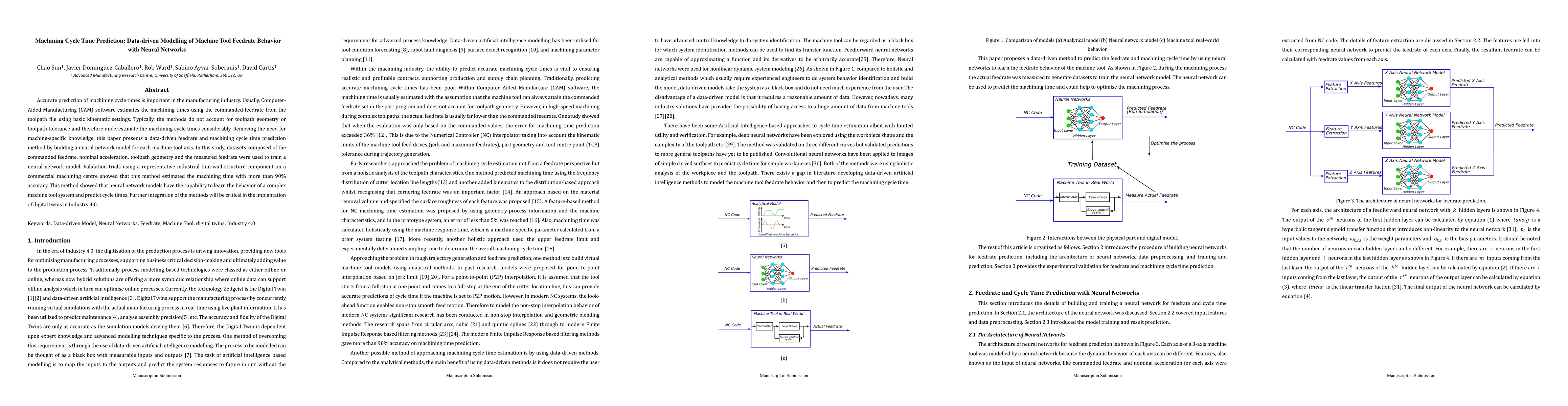This paper proposes a data-driven neural network model to predict machining cycle times by learning from machine tool feedrate behavior, outperforming traditional methods that underestimate cycle times. The model achieved over 90% accuracy in estimating machining times for an industrial component, demonstrating its potential for integration into digital twins in Industry 4.0.