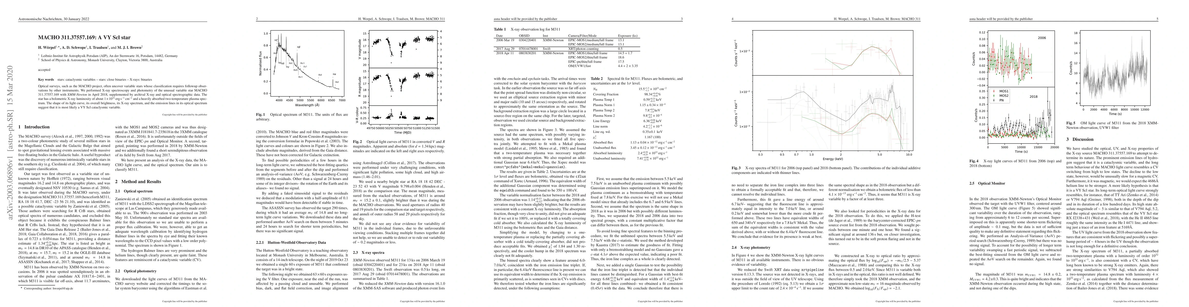 Optical surveys, such as the MACHO project, often uncover variable stars whose classification requires followup observations by other instruments. We performed X-ray spectroscopy and photometry of the unusual variable star MACHO 311.37557.169 with \XMM\ in April 2018, supplemented by archival X-ray and optical spectrographic data. The star has a bolometric X-ray luminosity of about $1\times 10^{32}$ erg s$^{-1}$ cm$^{-2}$ and a heavily absorbed two-temperature plasma spectrum. The shape of its light curve, its overall brightness, its X-ray spectrum, and the emission lines in its optical spectrum suggest that it is most likely a VY~Scl cataclysmic variable.