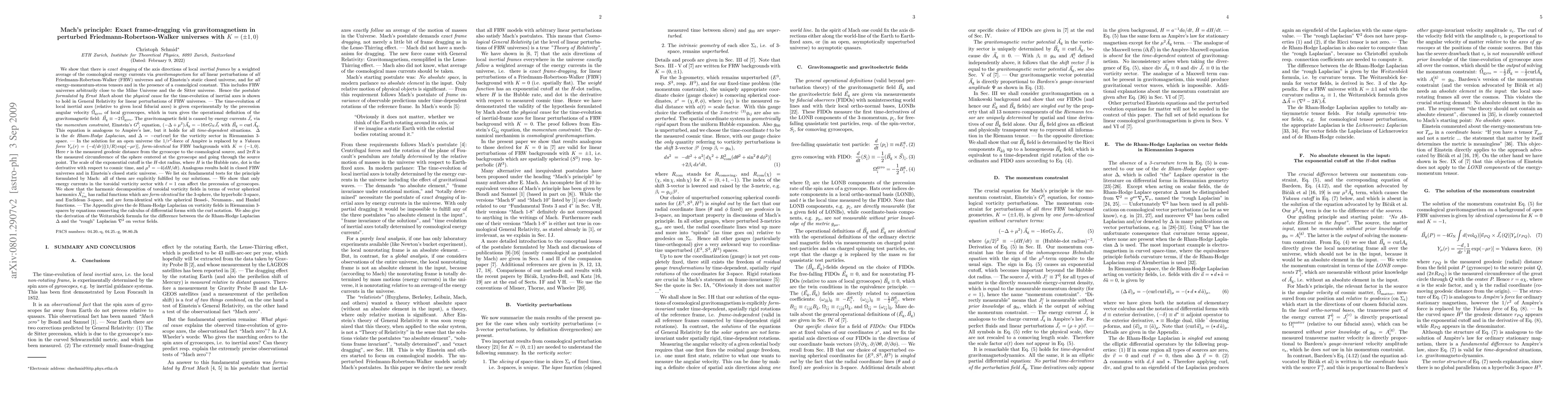 We show that the dragging of the axis directions of local inertial frames by a weighted average of the energy currents in the universe is exact for all linear perturbations of any Friedmann-Robertson-Walker (FRW) universe with K = (+1, -1, 0) and of Einstein's static closed universe. This includes FRW universes which are arbitrarily close to the Milne Universe, which is empty, and to the de Sitter universe. Hence the postulate formulated by E. Mach about the physical cause for the time-evolution of the axis directions of inertial frames is shown to hold in cosmological General Relativity for linear perturbations. The time-evolution of axis directions of local inertial frames (relative to given local fiducial axes) is given experimentally by the precession angular velocity of gyroscopes, which in turn is given by the operational definition of the gravitomagnetic field. The gravitomagnetic field is caused by cosmological energy currents via the momentum constraint. This equation for cosmological gravitomagnetism is analogous to Ampere's law, but it holds also for time-dependent situtations. In the solution for an open universe the 1/r^2-force of Ampere is replaced by a Yukawa force which is of identical form for FRW backgrounds with $K = (-1, 0).$ The scale of the exponential cutoff is the H-dot radius, where H is the Hubble rate, and dot is the derivative with respect to cosmic time. Analogous results hold for energy currents in a closed FRW universe, K = +1, and in Einstein's closed static universe.