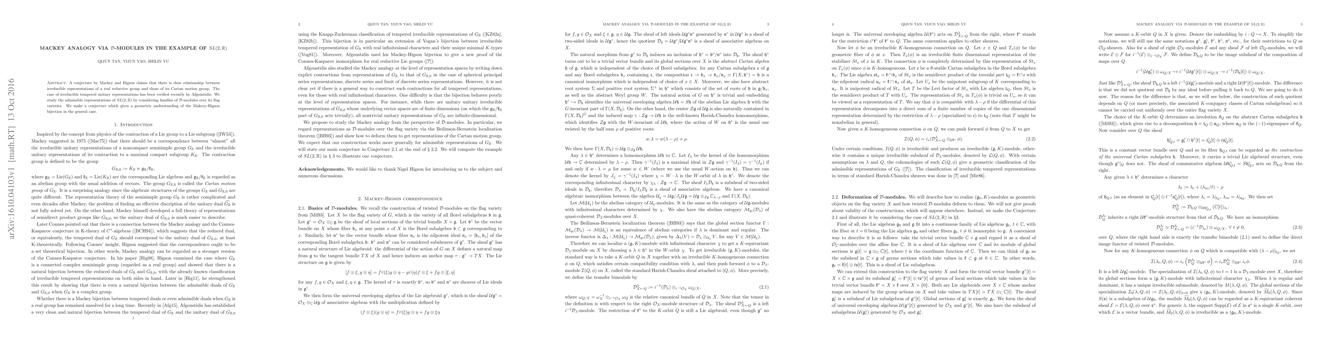 This paper explores the conjecture by Mackey and Higson regarding the relationship between irreducible representations of a real reductive group and its Cartan motion group, focusing on $SL(2,\mathbb{R})$. It proposes a geometric interpretation using $\mathcal{D}$-modules over flag varieties and makes a conjecture for a general understanding of the Mackey-Higson bijection.