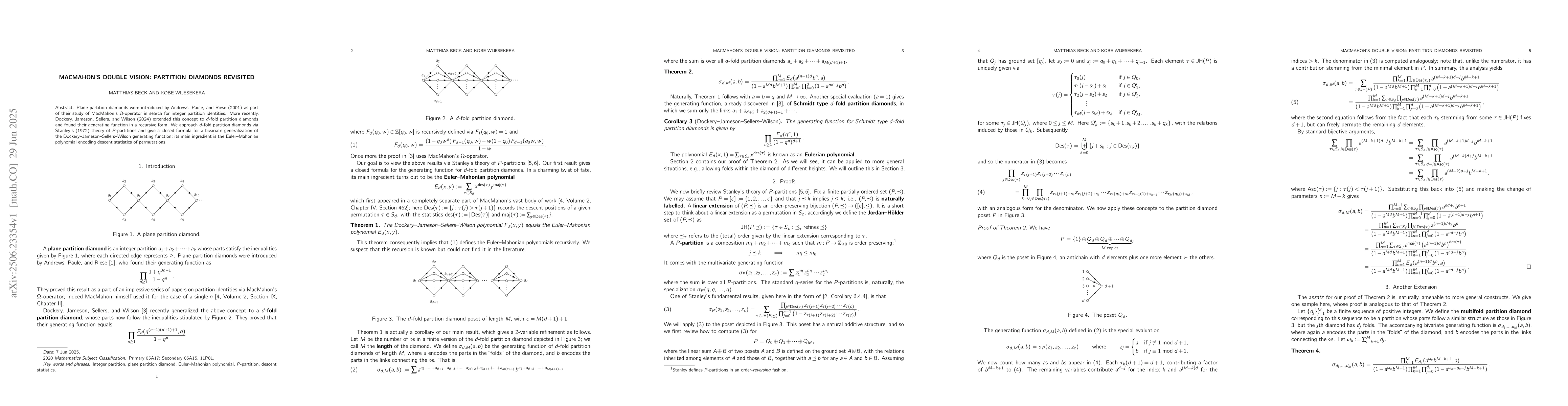 The paper presents a closed formula for d-fold partition diamonds' generating function using Stanley's P-partitions theory, linking it to Euler--Mahonian polynomials.