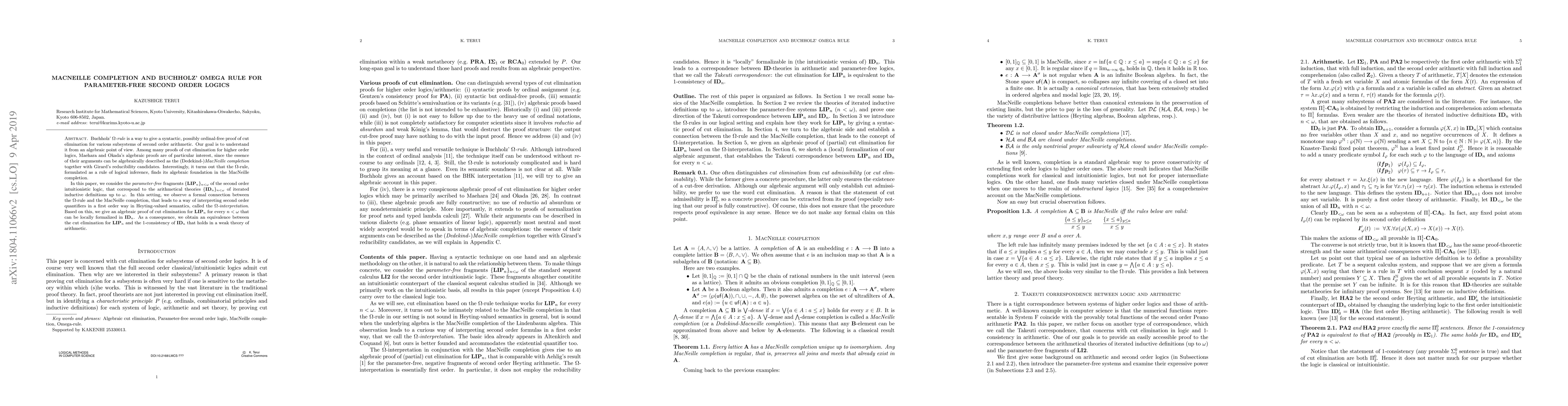 This paper investigates Buchholz's Omega-rule in the context of parameter-free second-order intuitionistic logics (LIPn) and connects it to the algebraic concept of the MacNeille completion. It proposes an Omega-interpretation for second-order quantifiers within Heyting-valued semantics and provides an algebraic proof for cut elimination in LIPn, establishing an equivalence between cut elimination and the 1-consistency of corresponding arithmetical theories IDn.