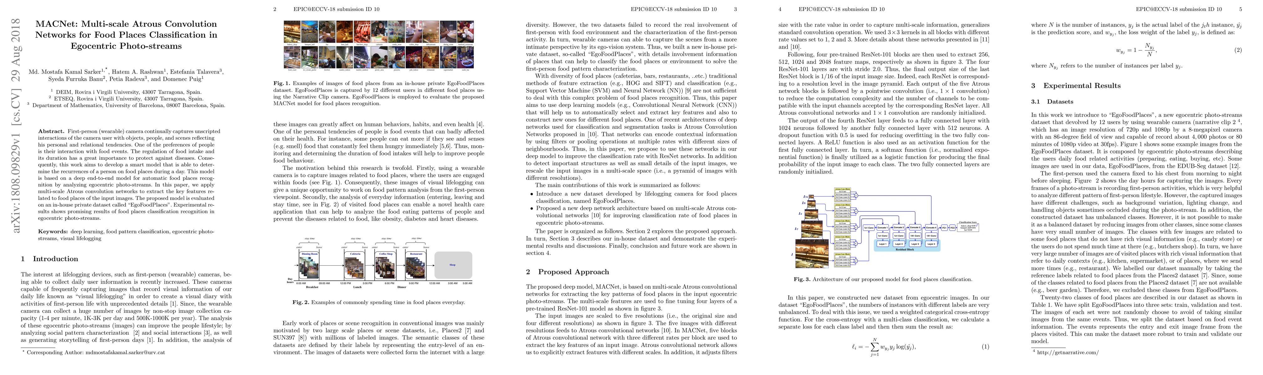 The paper proposes MACNet, a multi-scale Atrous convolution network for classifying food places in egocentric photo-streams captured by wearable cameras. The model demonstrates promising results in recognizing food-related interactions in a personal context, aiding in the regulation of food intake.