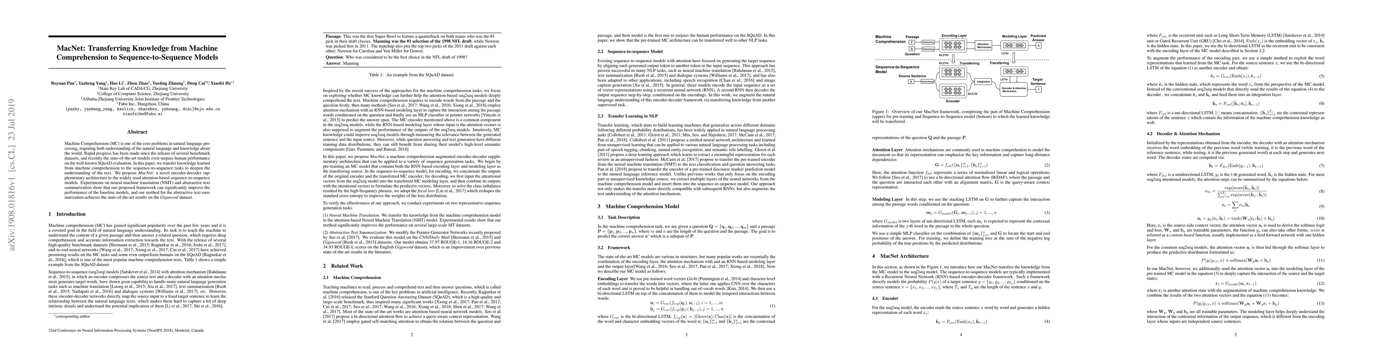 MacNet transfers knowledge from machine comprehension to sequence-to-sequence models, significantly enhancing performance in neural machine translation and abstractive text summarization, achieving state-of-the-art results on the Gigaword dataset.