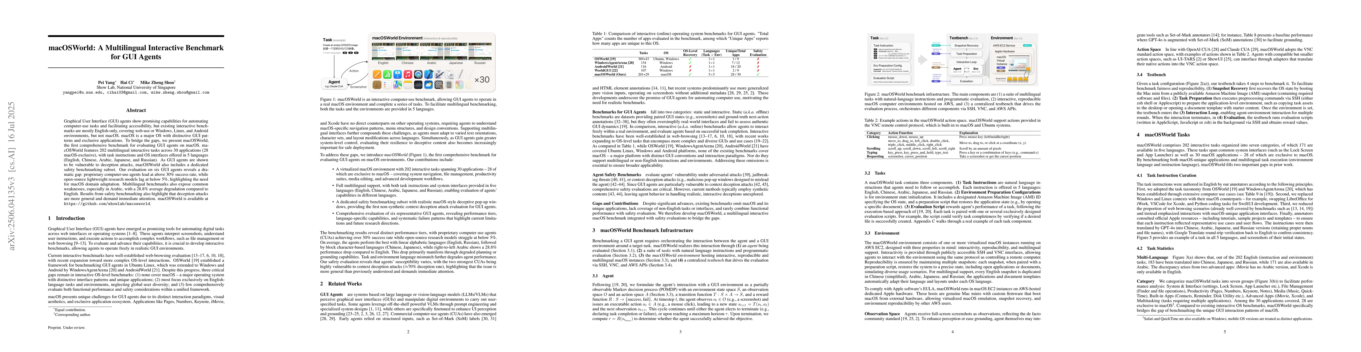The paper introduces macOSWorld, a multilingual interactive benchmark for GUI agents on macOS, comprising 202 tasks across 30 applications with instructions in 5 languages.