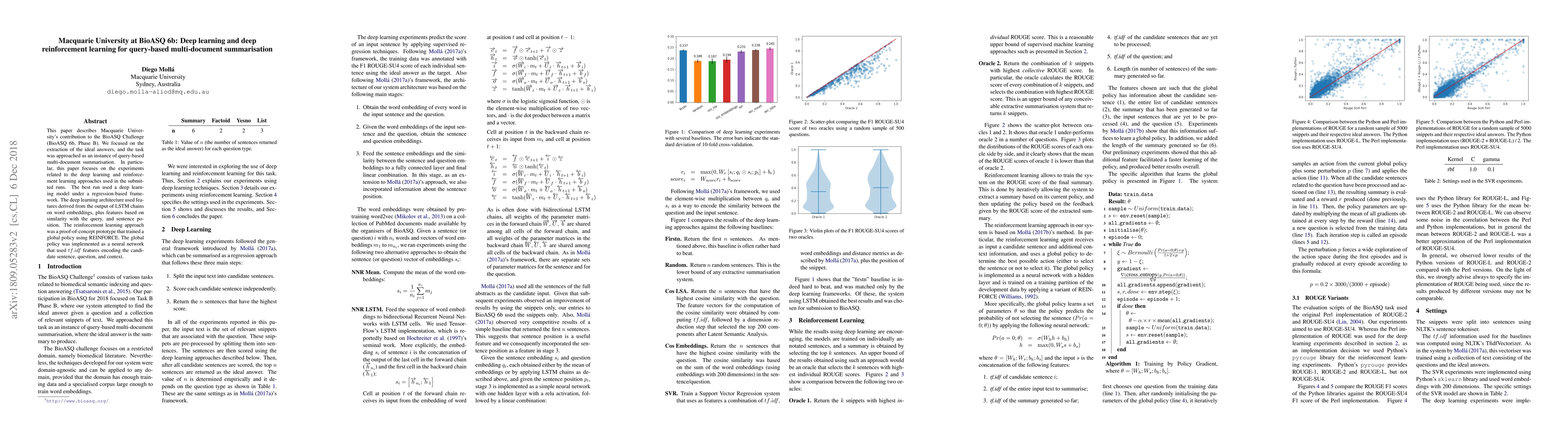 This paper describes Macquarie University's contribution to the BioASQ Challenge (BioASQ 6b, Phase B). We focused on the extraction of the ideal answers, and the task was approached as an instance of query-based multi-document summarisation. In particular, this paper focuses on the experiments related to the deep learning and reinforcement learning approaches used in the submitted runs. The best run used a deep learning model under a regression-based framework. The deep learning architecture used features derived from the output of LSTM chains on word embeddings, plus features based on similarity with the query, and sentence position. The reinforcement learning approach was a proof-of-concept prototype that trained a global policy using REINFORCE. The global policy was implemented as a neural network that used $tf.idf$ features encoding the candidate sentence, question, and context.