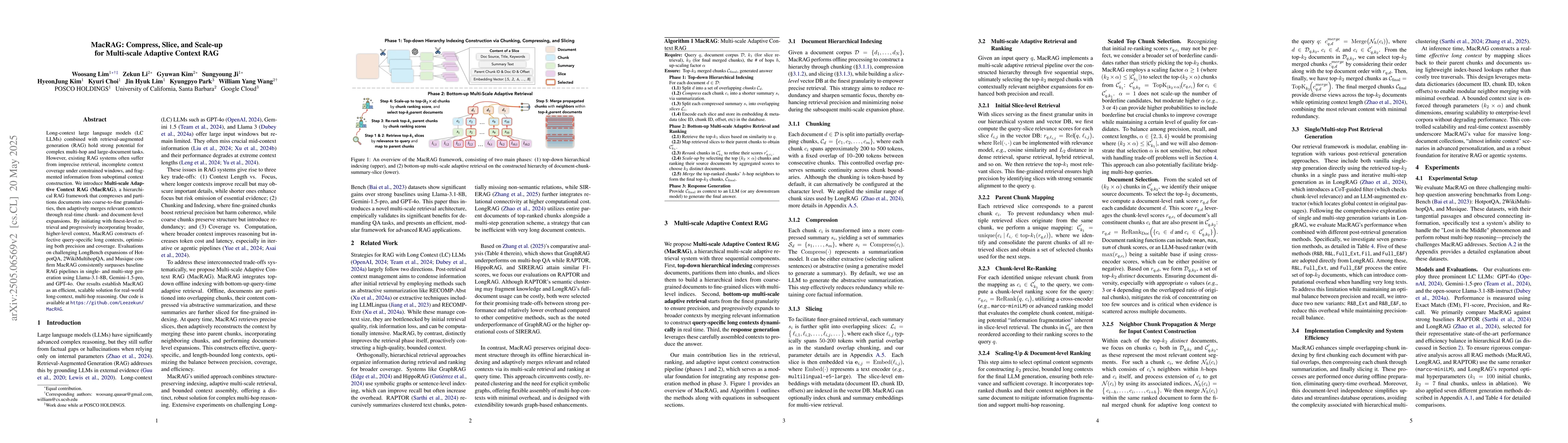 MacRAG introduces a novel hierarchical RAG framework that compresses, slices, and scales up contexts for multi-scale adaptive retrieval, enhancing precision and coverage in long-context, multi-hop reasoning tasks.