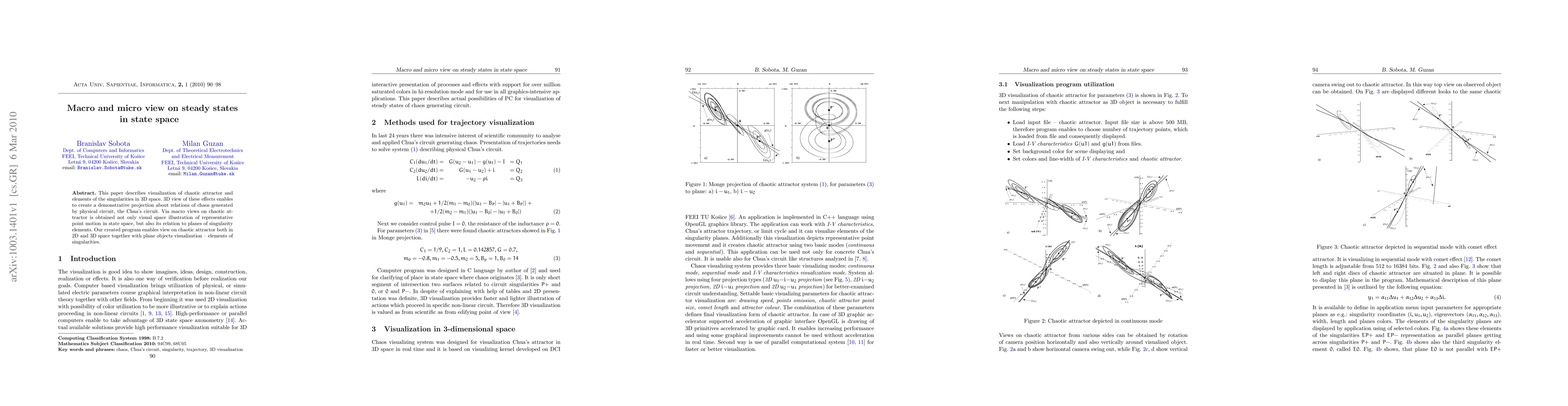 This paper describes visualization of chaotic attractor and elements of the singularities in 3D space. 3D view of these effects enables to create a demonstrative projection about relations of chaos generated by physical circuit, the Chua's circuit. Via macro views on chaotic attractor is obtained not only visual space illustration of representative point motion in state space, but also its relation to planes of singularity elements. Our created program enables view on chaotic attractor both in 2D and 3D space together with plane objects visualization -- elements of singularities.