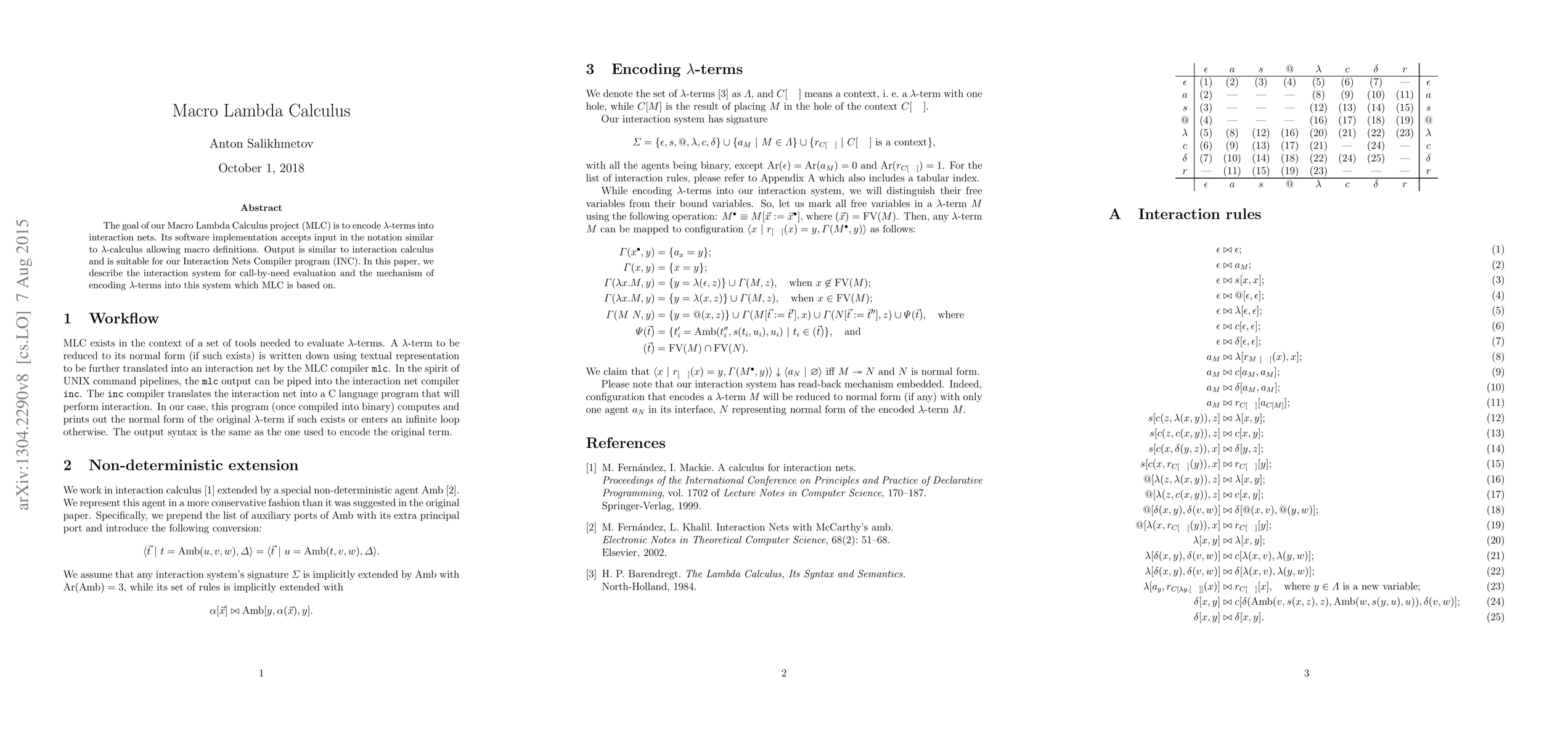 The Macro Lambda Calculus project aims to encode lambda terms into interaction nets, providing a software tool that accepts macro-defined lambda calculus input and outputs suitable for an Interaction Nets Compiler, focusing on a call-by-need evaluation interaction system.