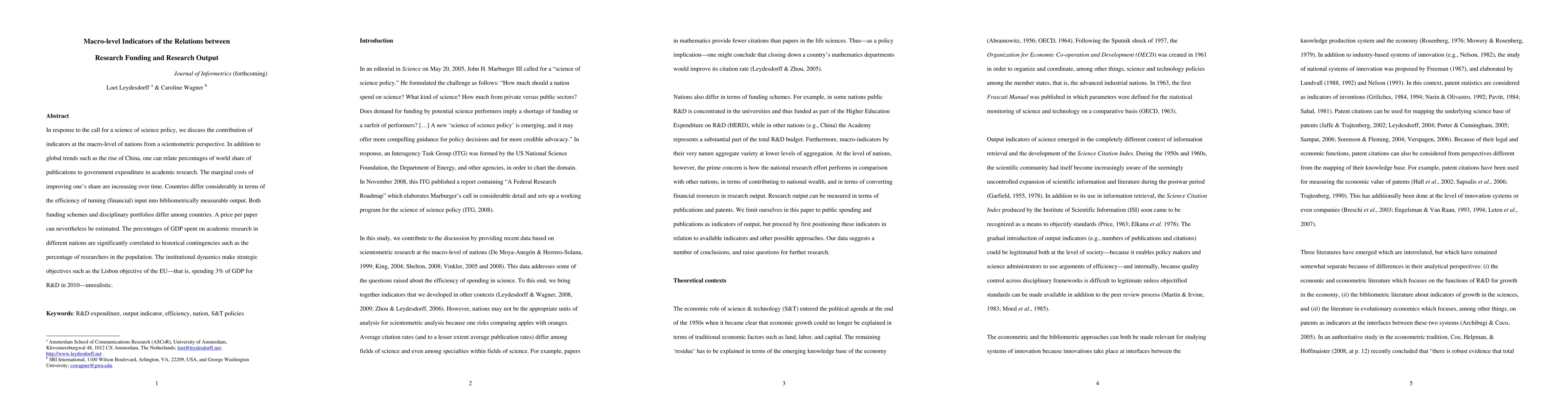 In response to the call for a science of science policy, we discuss the contribution of indicators at the macro-level of nations from a scientometric perspective. In addition to global trends such as the rise of China, one can relate percentages of world share of publications to government expenditure in academic research. The marginal costs of improving one's share are increasing over time. Countries differ considerably in terms of the efficiency of turning (financial) input into bibliometrically measurable output. Both funding schemes and disciplinary portfolios differ among countries. A price per paper can nevertheless be estimated. The percentages of GDP spent on academic research in different nations are significantly correlated to historical contingencies such as the percentage of researchers in the population. The institutional dynamics make strategic objectives such as the Lisbon objective of the EU--that is, spending 3% of GDP for R&D in 2010--unrealistic.