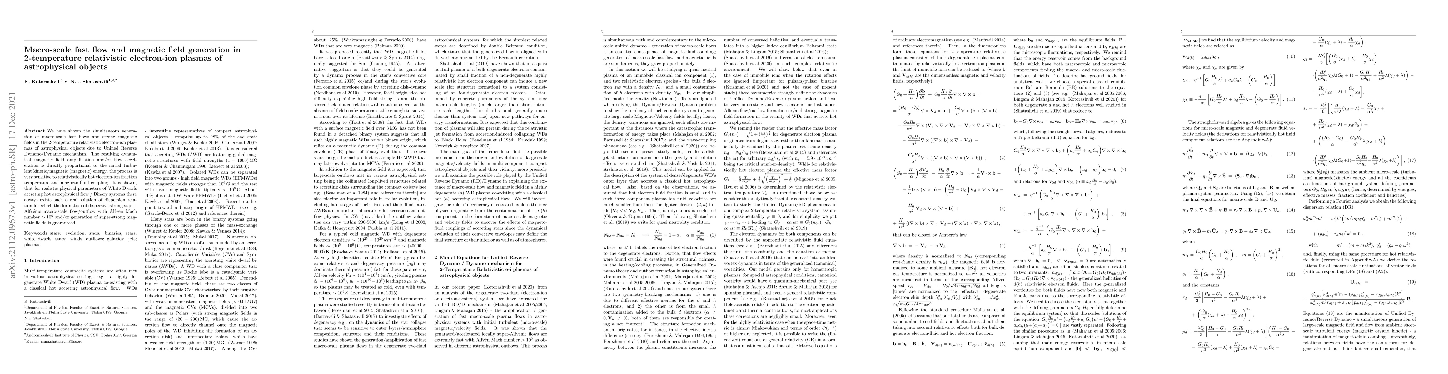 We have shown the simultaneous generation of macro-scale fast flows and strong magnetic fields in the 2-temperature relativistic electron-ion plasmas of astrophysical objects due to Unified Reverse Dynamo/Dynamo mechanism. The resulting dynamical magnetic field amplification and/or flow acceleration is directly proportional to the initial turbulent kinetic/magnetic (magnetic) energy; the process is very sensitive to relativistically hot electron-ion fraction temperature and magneto-fluid coupling. It is shown, that for realistic physical parameters of White Dwarfs accreting hot astrophysical flow / Binary systems there always exists such a real solution of dispersion relation for which the formation of dispersive strong super-Alfv\'enic macro-scale flow/outflow with Alfv\'en Mach number $> 10^6$ and/or generation of super-strong magnetic fields is guaranteed.