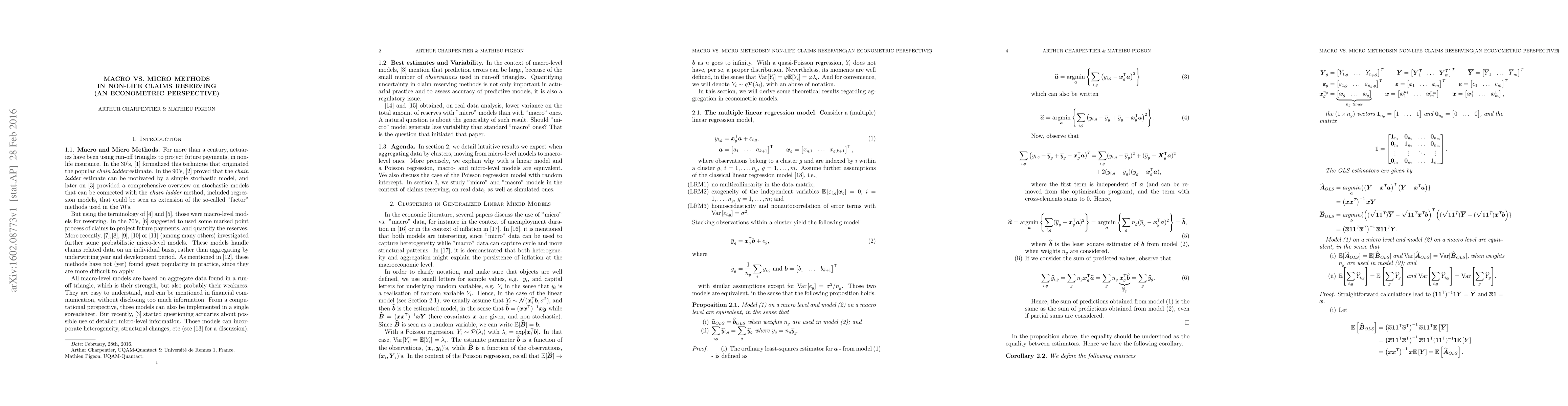 Traditionally, actuaries have used run-off triangles to estimate reserve ("macro" models, on agregated data). But it is possible to model payments related to individual claims. If those models provide similar estimations, we investigate uncertainty related to reserves, with "macro" and "micro" models. We study theoretical properties of econometric models (Gaussian, Poisson and quasi-Poisson) on individual data, and clustered data. Finally, application on claims reserving are considered.