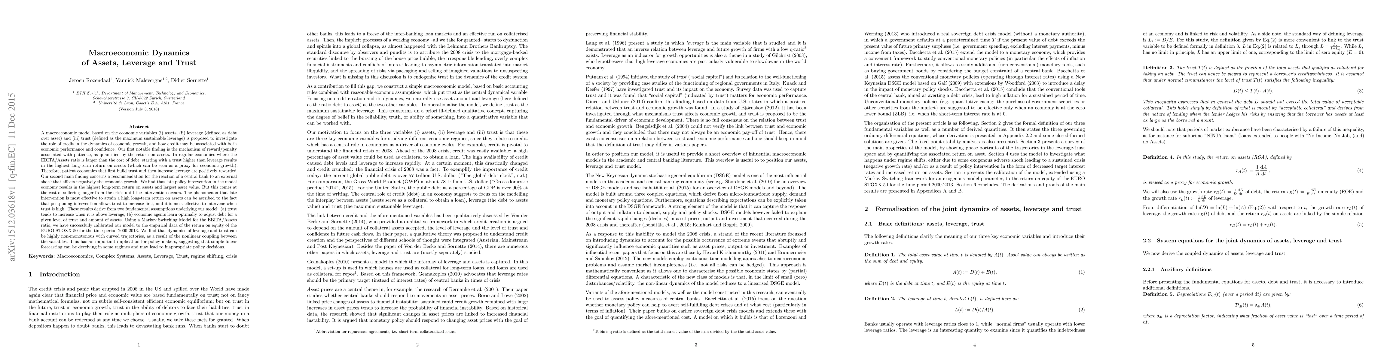 A macroeconomic model based on the economic variables (i) assets, (ii) leverage (defined as debt over asset) and (iii) trust (defined as the maximum sustainable leverage) is proposed to investigate the role of credit in the dynamics of economic growth, and how credit may be associated with both economic performance and confidence. Our first notable finding is the mechanism of reward/penalty associated with patience, as quantified by the return on assets. In regular economies where the EBITA/Assets ratio is larger than the cost of debt, starting with a trust higher than leverage results in the highest long-term return on assets (which can be seen as a proxy for economic growth). Our second main finding concerns a recommendation for the reaction of a central bank to an external shock that affects negatively the economic growth. We find that late policy intervention in the model economy results in the highest long-term return on assets and largest asset value. But this comes at the cost of suffering longer from the crisis until the intervention occurs. The phenomenon can be ascribed to the fact that postponing intervention allows trust to increase first, and it is most effective to intervene when trust is high. These results derive from two fundamental assumptions underlying our model: (a) trust tends to increase when it is above leverage; (b) economic agents learn optimally to adjust debt for a given level of trust and amount of assets. Using a Markov Switching Model for the EBITA/Assets ratio, we have successfully calibrated our model to the empirical data of the return on equity of the EURO STOXX 50 for the time period 2000-2013. We find that dynamics of leverage and trust can be highly non-monotonous with curved trajectories, as a result of the nonlinear coupling between the variables.