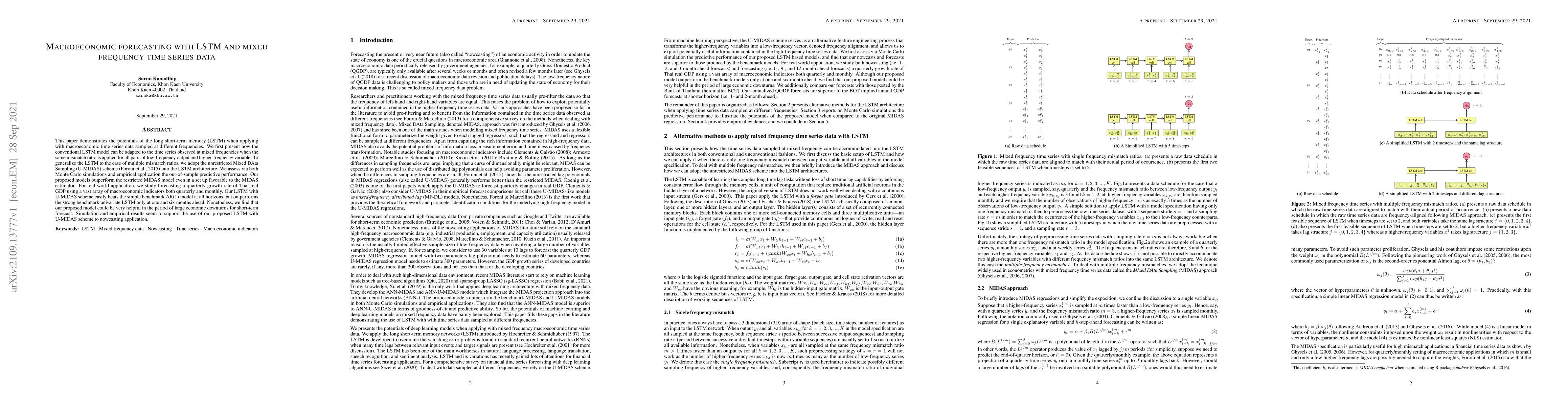 This paper explores the use of LSTM models adapted for mixed frequency macroeconomic time series data, showing improved forecasting performance over traditional methods. The proposed LSTM with U-MIDAS scheme outperforms benchmarks, especially during economic downturns for short-term forecasts.