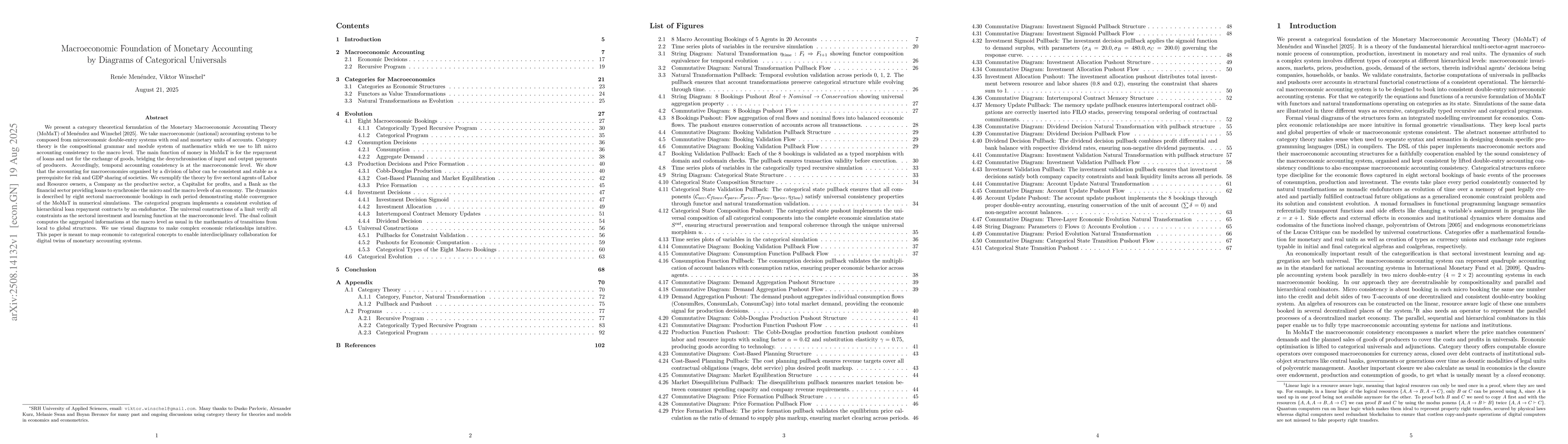 This paper introduces a category-theoretical framework for Monetary Macroeconomic Accounting Theory (MoMaT), emphasizing money's role in loan repayment over good exchange. It demonstrates macroeconomic consistency via temporal accounting, stable risk-sharing, and GDP among sectoral agents, including labor, resource owners, companies, capitalists, and banks. The theory is exemplified through eight macroeconomic bookings, verified by universal and dual constructions, and aims to foster interdisciplinary collaboration for digital twins of monetary systems.