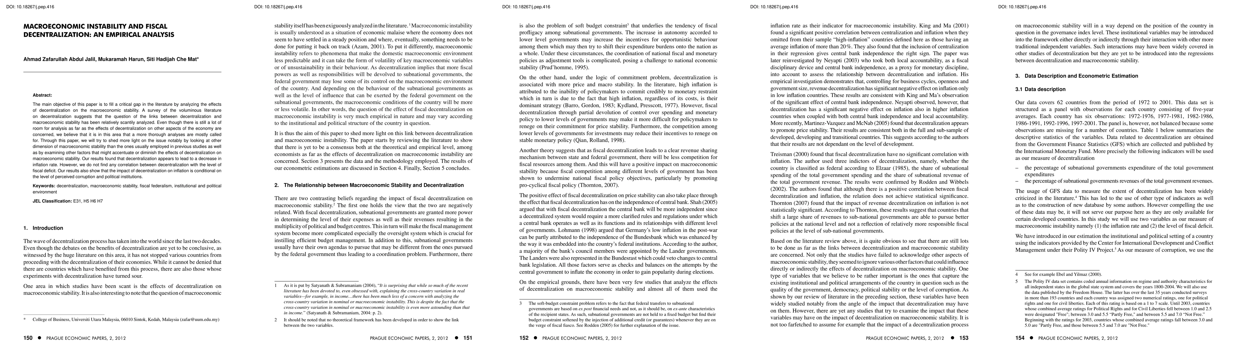 This paper investigates the impact of fiscal decentralization on macroeconomic stability, finding that decentralization tends to lower inflation rates but does not correlate with fiscal deficits. The study highlights that the effect on inflation is contingent on perceived corruption levels and political institutions.