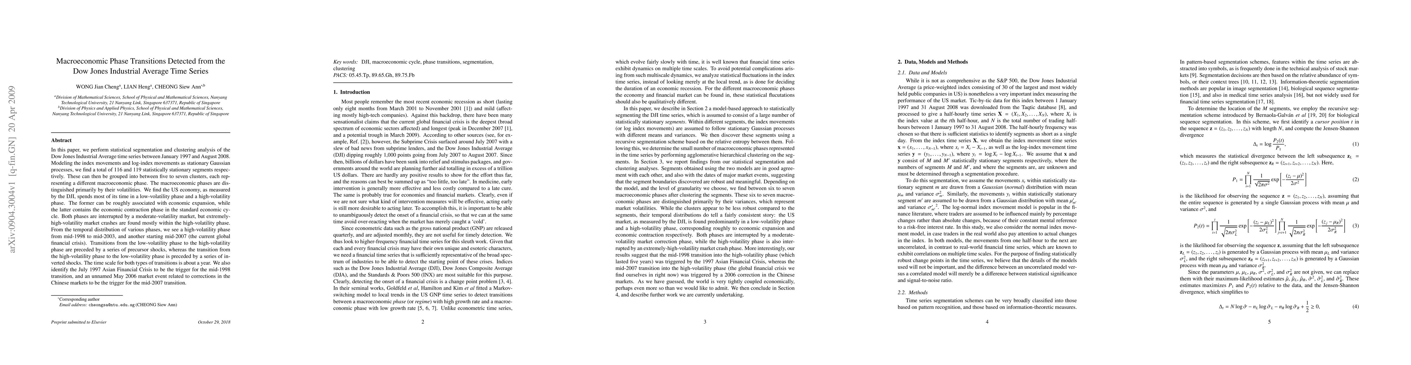 In this paper, we perform statistical segmentation and clustering analysis of the Dow Jones Industrial Average time series between January 1997 and August 2008. Modeling the index movements and log-index movements as stationary Gaussian processes, we find a total of 116 and 119 statistically stationary segments respectively. These can then be grouped into between five to seven clusters, each representing a different macroeconomic phase. The macroeconomic phases are distinguished primarily by their volatilities. We find the US economy, as measured by the DJI, spends most of its time in a low-volatility phase and a high-volatility phase. The former can be roughly associated with economic expansion, while the latter contains the economic contraction phase in the standard economic cycle. Both phases are interrupted by a moderate-volatility market, but extremely-high-volatility market crashes are found mostly within the high-volatility phase. From the temporal distribution of various phases, we see a high-volatility phase from mid-1998 to mid-2003, and another starting mid-2007 (the current global financial crisis). Transitions from the low-volatility phase to the high-volatility phase are preceded by a series of precursor shocks, whereas the transition from the high-volatility phase to the low-volatility phase is preceded by a series of inverted shocks. The time scale for both types of transitions is about a year. We also identify the July 1997 Asian Financial Crisis to be the trigger for the mid-1998 transition, and an unnamed May 2006 market event related to corrections in the Chinese markets to be the trigger for the mid-2007 transition.