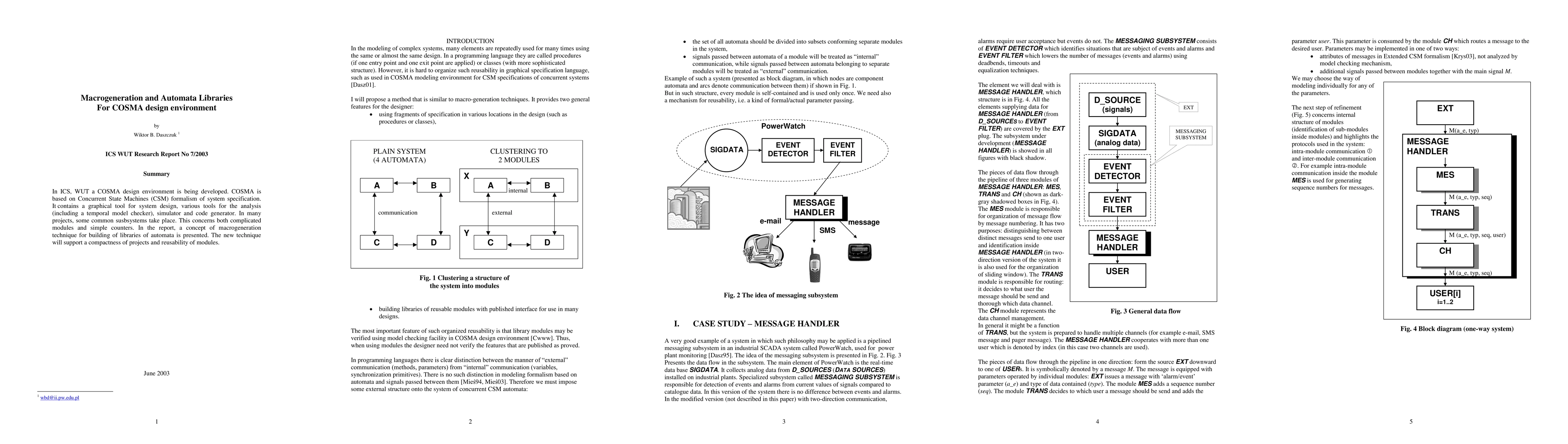 This paper introduces a macrogeneration technique for creating libraries of automata within the COSMA design environment, aimed at enhancing project compactness and module reusability in Concurrent State Machines formalism. The technique supports the development of both complex modules and simple counters in the graphical tool and analysis tools of COSMA.