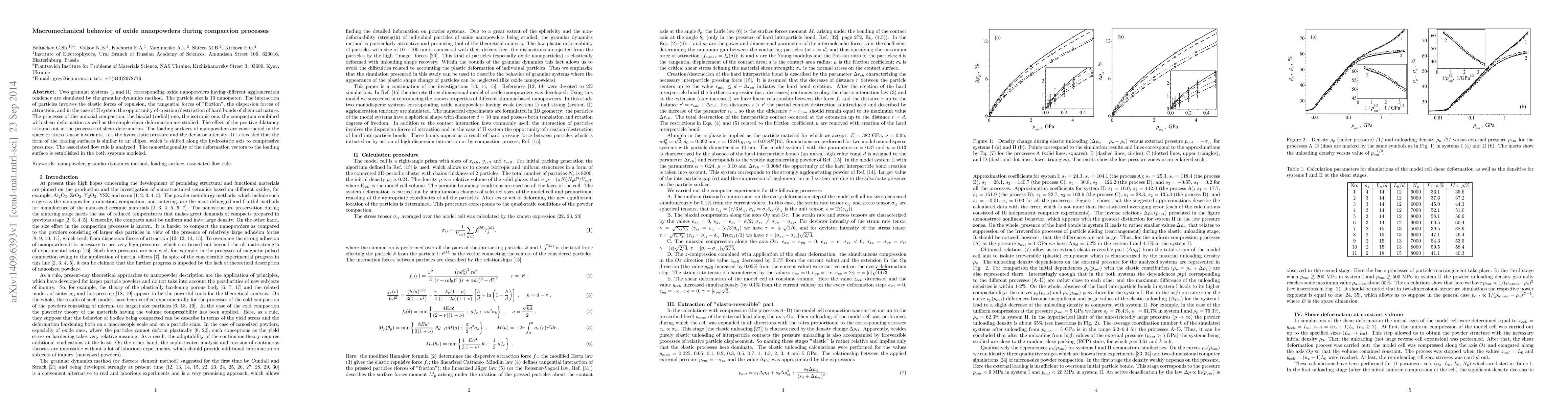 This paper investigates the macromechanical behavior of two oxide nanopowder systems during various compaction processes using granular dynamics. The study reveals the influence of different interaction forces and the formation of hard chemical bonds in one system, leading to unique loading surfaces and non-orthogonal deformation vectors.