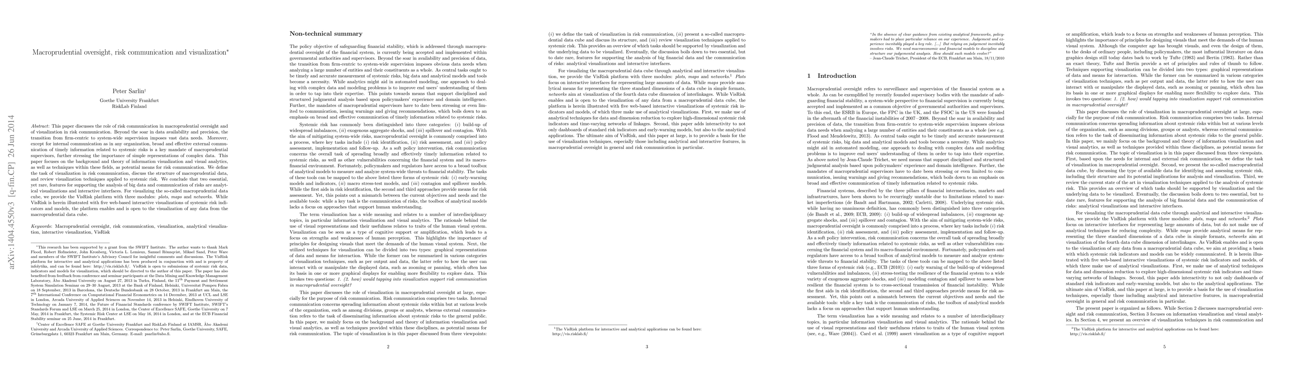 This paper explores the significance of risk communication and visualization in macroprudential oversight, emphasizing the need for effective external communication of systemic risk information. It introduces the VisRisk platform, which utilizes analytical visualizations and interactive interfaces to represent complex macroprudential data, thereby aiding in the analysis and communication of systemic risks.