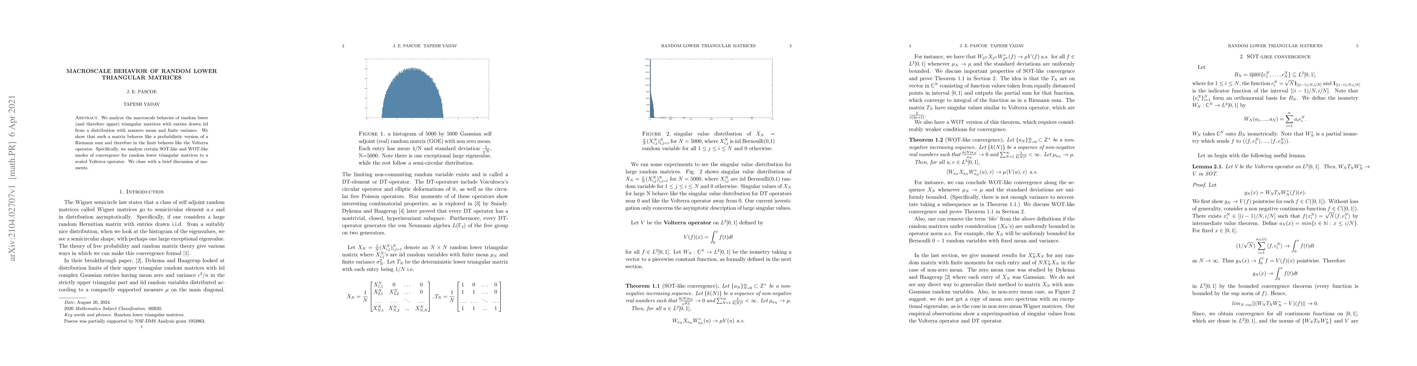 This paper investigates the macroscale behavior of random lower triangular matrices, demonstrating their convergence to a scaled Volterra operator as a probabilistic Riemann sum. It examines both SOT-like and WOT-like modes of convergence and briefly discusses the moments of these matrices.