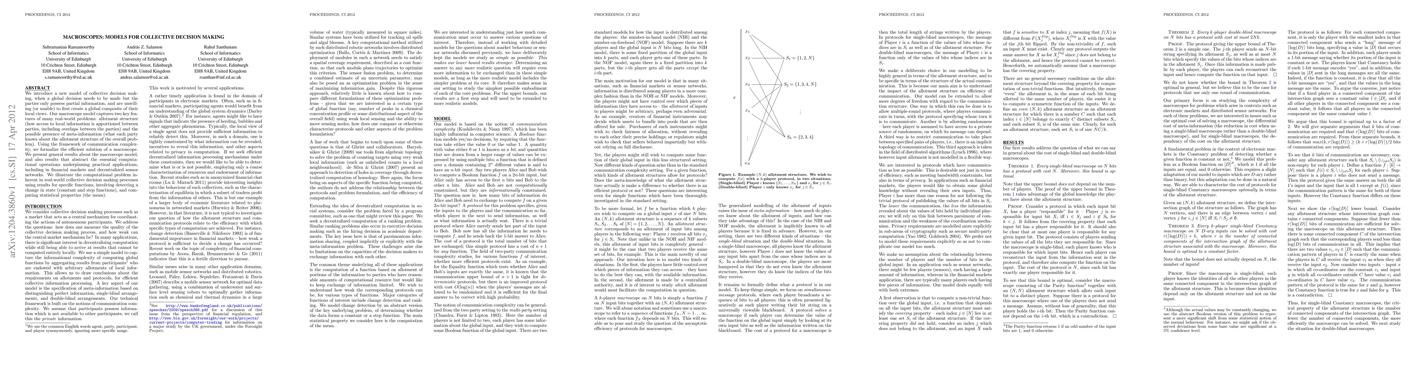 This paper introduces a macroscope model for collective decision making where parties have partial information and cannot combine their views. It formalizes the model using communication complexity, focusing on allotment structure and meta-information, and applies it to practical scenarios like financial markets and sensor networks.
