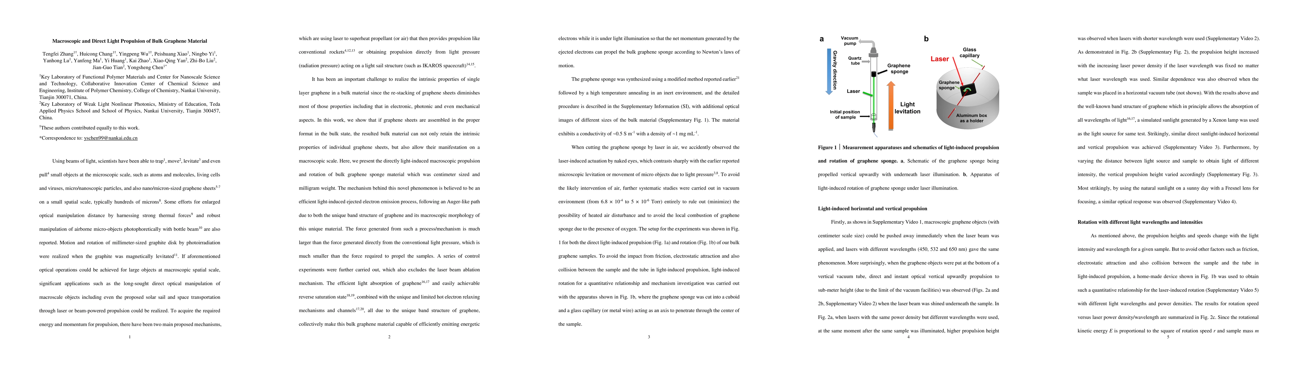 It has been a great challenge to achieve the direct light manipulation of matter on a bulk scale. In this work, the direct light propulsion of matter was observed on a macroscopic scale for the first time using a bulk graphene based material. The unique structure and properties of graphene and the morphology of the bulk graphene material make it capable of not only absorbing light at various wavelengths but also emitting energetic electrons efficiently enough to drive the bulk material following Newtonian mechanics. Thus, the unique photonic and electronic properties of individual graphene sheets are manifested in the response of the bulk state. These results offer an exciting opportunity to bring about bulk scale light manipulation with the potential to realize long-sought proposals in areas such as the solar sail and space transportation driven directly by sunlight.