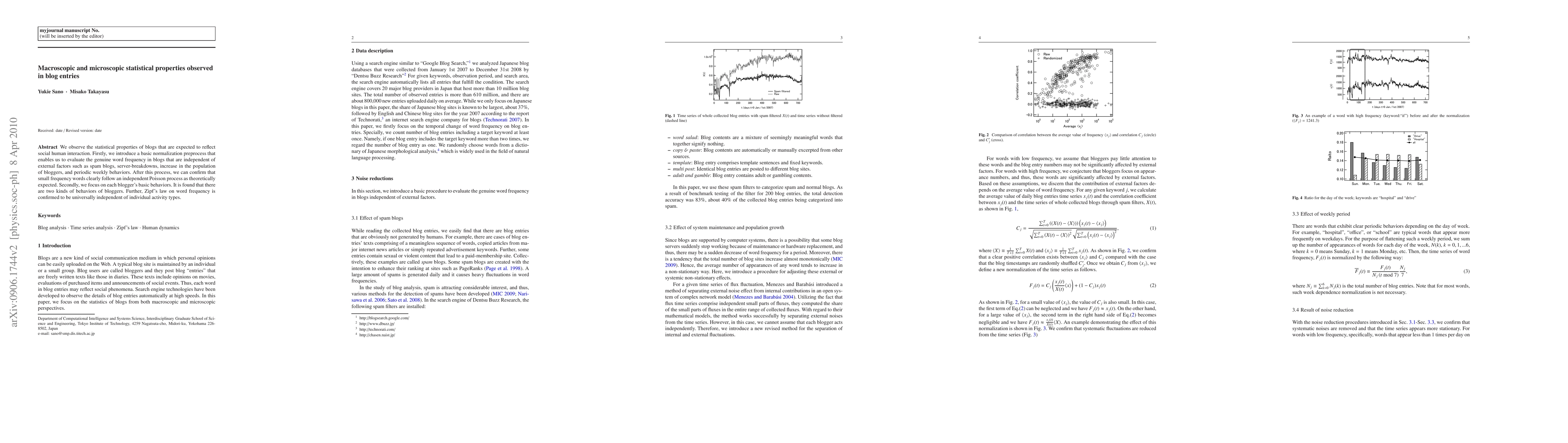 We observe the statistical properties of blogs that are expected to reflect social human interaction. Firstly, we introduce a basic normalization preprocess that enables us to evaluate the genuine word frequency in blogs that are independent of external factors such as spam blogs, server-breakdowns, increase in the population of bloggers, and periodic weekly behaviors. After this process, we can confirm that small frequency words clearly follow an independent Poisson process as theoretically expected. Secondly, we focus on each blogger's basic behaviors. It is found that there are two kinds of behaviors of bloggers. Further, Zipf's law on word frequency is confirmed to be universally independent of individual activity types.
