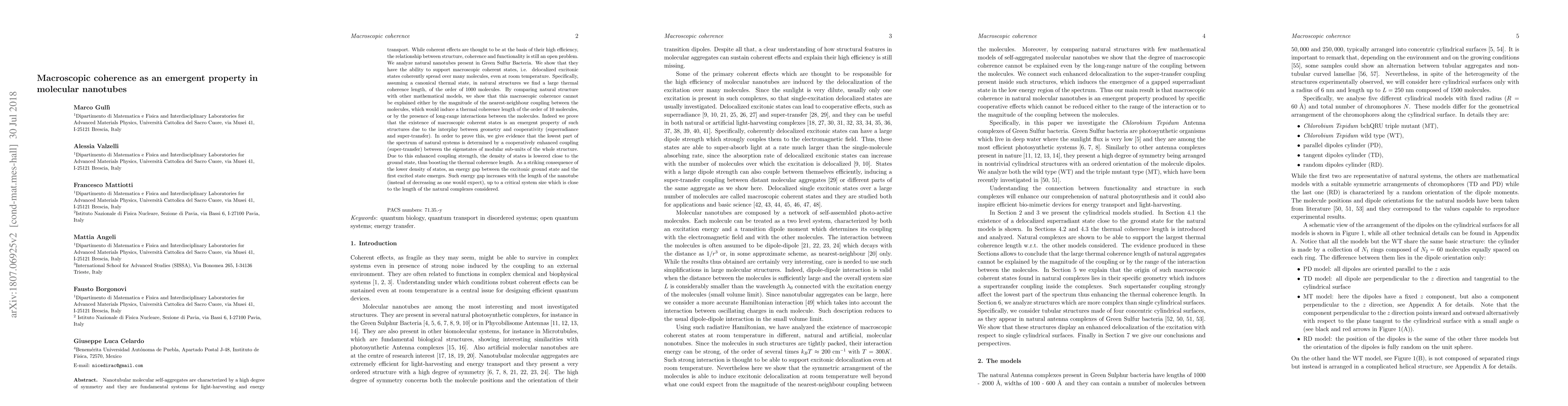 Nanotubular molecular self-aggregates are characterized by a high degree of symmetry and they are fundamental systems for light-harvesting and energy transport. While coherent effects are thought to be at the basis of their high efficiency, the relationship between structure, coherence and functionality is still an open problem. We analyze natural nanotubes present in Green Sulfur Bacteria. We show that they have the ability to support macroscopic coherent states, i.e. delocalized excitonic states coherently spread over many molecules, even at room temperature. Specifically, assuming a canonical thermal state, in natural structures we find a large thermal coherence length, of the order of 1000 molecules. By comparing natural structure with other mathematical models, we show that this macroscopic coherence cannot be explained either by the magnitude of the nearest-neighbour coupling between the molecules, which would induce a thermal coherence length of the order of 10 molecules, or by the presence of long-range interactions between the molecules. Indeed we prove that the existence of macroscopic coherent states is an emergent property of such structures due to the interplay between geometry and cooperativity (superradiance and super-transfer). In order to prove this, we give evidence that the lowest part of the spectrum of natural systems is determined by a cooperatively enhanced coupling (super-transfer) between the eigenstates of modular sub-units of the whole structure. Due to this enhanced coupling strength, the density of states is lowered close to the ground state, thus boosting the thermal coherence length.