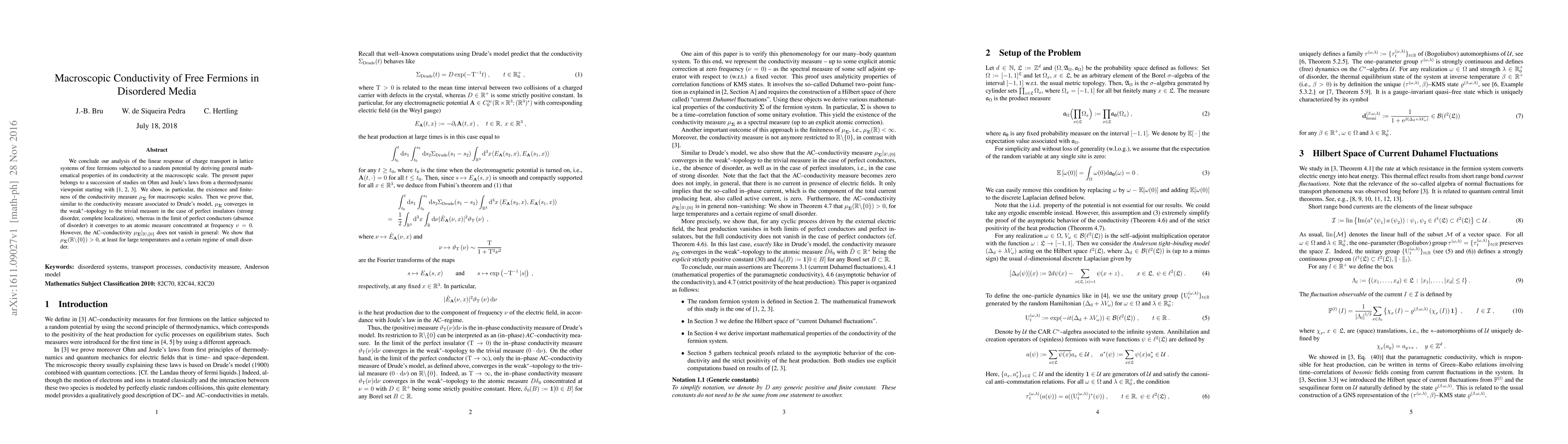 We conclude our analysis of the linear response of charge transport in lattice systems of free fermions subjected to a random potential by deriving general mathematical properties of its conductivity at the macroscopic scale. The present paper belongs to a succession of studies on Ohm and Joule's laws from a thermodynamic viewpoint. We show, in particular, the existence and finiteness of the conductivity measure $\mu _{\mathbf{\Sigma }}$ for macroscopic scales. Then we prove that, similar to the conductivity measure associated to Drude's model, $\mu _{\mathbf{\Sigma }}$ converges in the weak$^{\ast } $-topology to the trivial measure in the case of perfect insulators (strong disorder, complete localization), whereas in the limit of perfect conductors (absence of disorder) it converges to an atomic measure concentrated at frequency $\nu =0$. However, the AC--conductivity $\mu _{\mathbf{\Sigma }}|_{\mathbb{R}\backslash \{0\}}$ does not vanish in general: We show that $\mu _{\mathbf{\Sigma }}(\mathbb{R}\backslash \{0\})>0$, at least for large temperatures and a certain regime of small disorder.