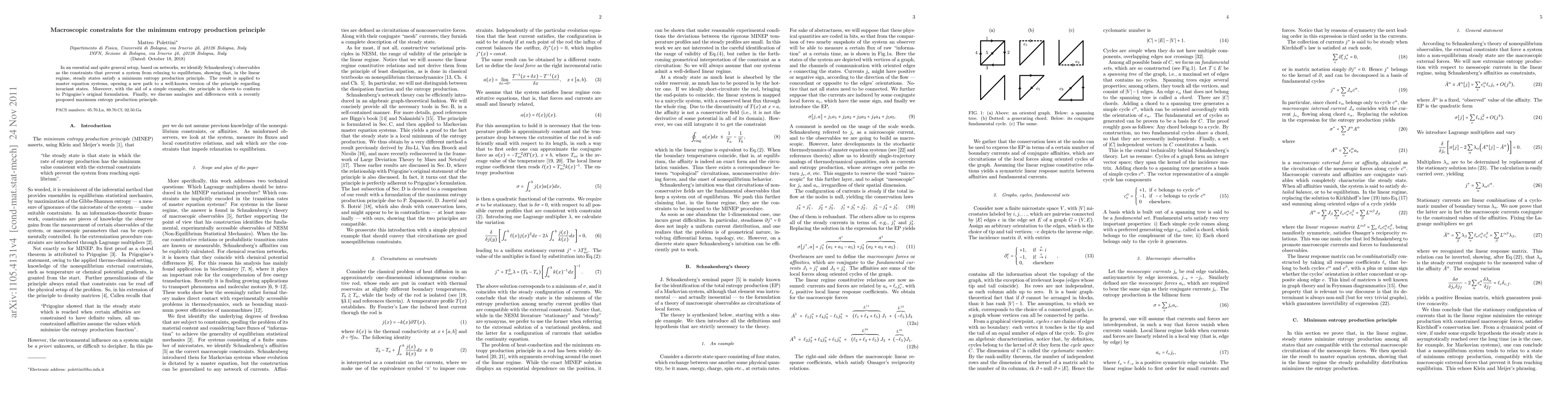 This paper identifies Schnakenberg's observables as macroscopic constraints that uphold the minimum entropy production principle in linear regime steady states, applying this principle to master equation systems and discussing its alignment with Prigogine's original formulation, while contrasting it with a recently proposed maximum entropy production principle.