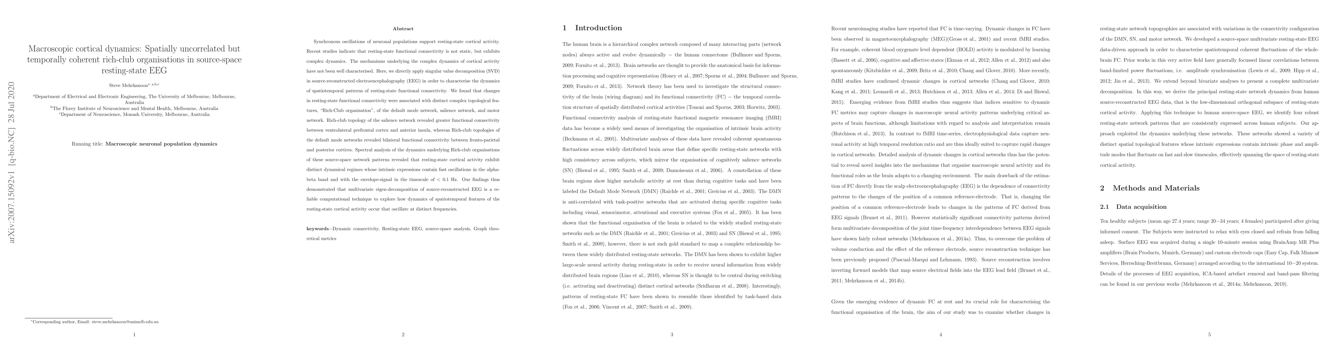 This study uses source-reconstructed EEG and singular value decomposition to explore the dynamics of resting-state cortical activity, revealing complex spatiotemporal patterns characterized by "Rich-Club organisation" in default, salience, and motor networks. The findings show that these networks exhibit temporally coherent yet spatially uncorrelated dynamics, oscillating primarily in the alpha-beta band and with slower envelope-signals.