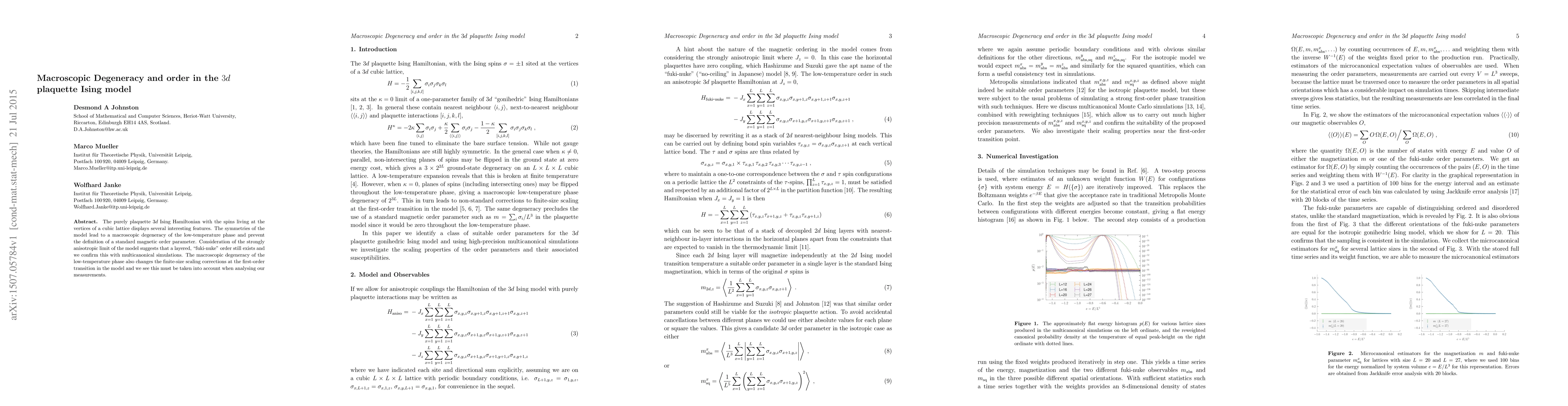 This paper investigates the macroscopic degeneracy and order in the 3d plaquette Ising model, revealing a low-temperature phase with significant degeneracy and no standard magnetic order. Multicanonical simulations confirm the existence of a "fuki-nuke" order in the strongly anisotropic limit, and finite-size scaling corrections at the first-order transition are also affected by this degeneracy.