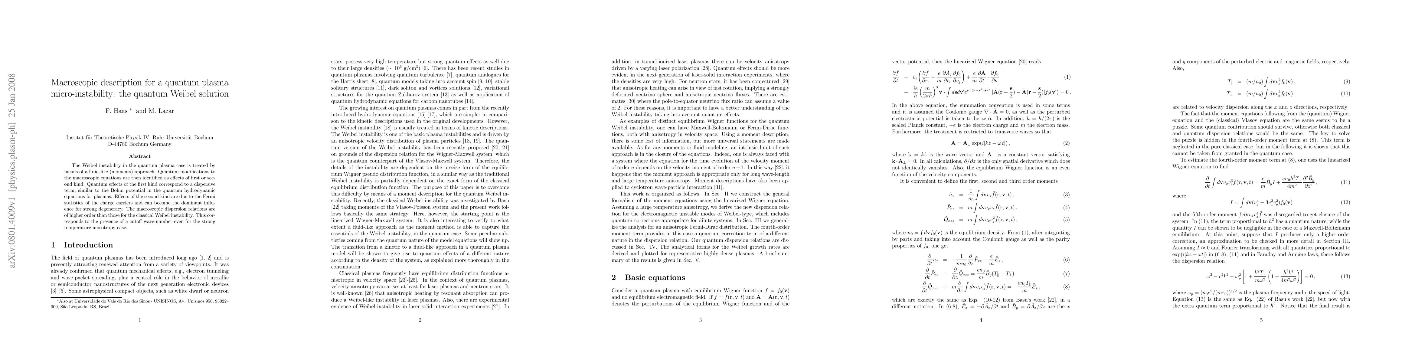 The Weibel instability in the quantum plasma case is treated by means of a fluid-like (moments) approach. Quantum modifications to the macroscopic equations are then identified as effects of first or second kind. Quantum effects of the first kind correspond to a dispersive term, similar to the Bohm potential in the quantum hydrodynamic equations for plasmas. Effects of the second kind are due to the Fermi statistics of the charge carriers and can become the dominant influence for strong degeneracy. The macroscopic dispersion relations are of higher order than those for the classical Weibel instability. This corresponds to the presence of a cutoff wave-number even for the strong temperature anisotropy case.