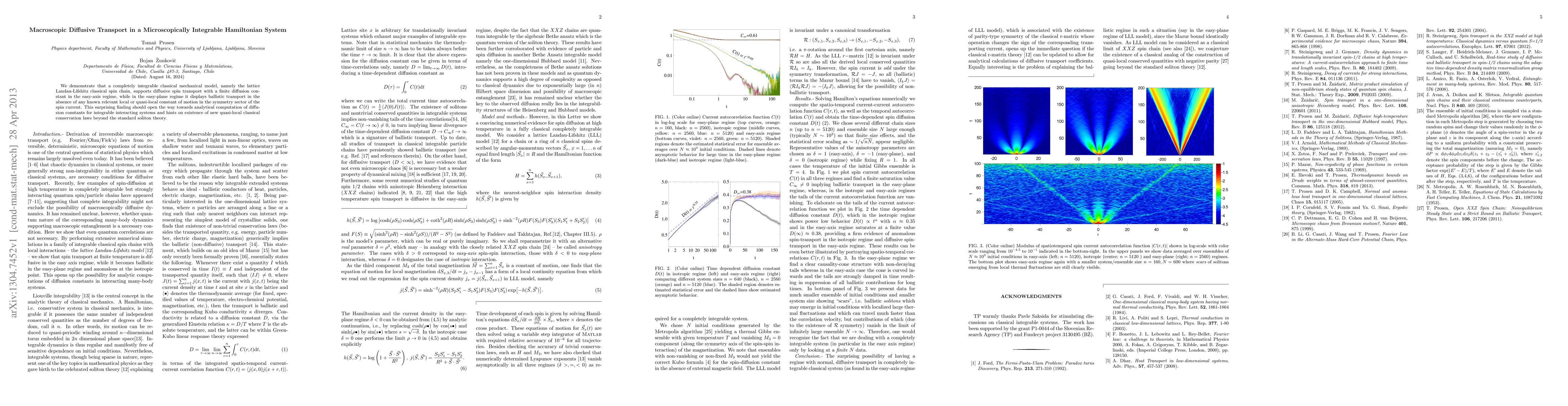 This paper reveals that the lattice Landau-Lifshitz spin chain, an integrable classical model, exhibits diffusive spin transport in the easy-axis regime and ballistic transport in the easy-plane regime, challenging conventional conservation laws and suggesting new quasi-local conservation laws.