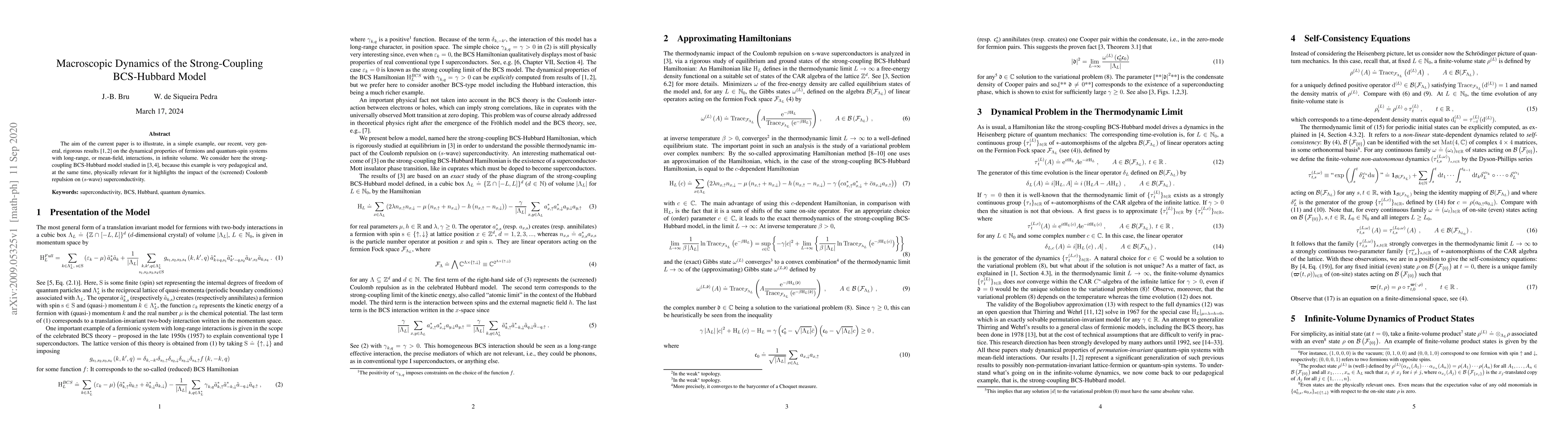 The aim of the current paper is to illustrate, in a simple example, our recent, very general, rigorous results [Bru J.-B., de Siqueira Pedra W., J. Math. Anal. Appl. (2020), doi.org: 10.1016/j.jmaa.2020.124434 and 10.1016/j.jmaa.2020.124517] on the dynamical properties of fermions and quantum-spin systems with long-range, or mean-field, interactions, in infinite volume. We consider here the strong-coupling BCS-Hubbard model, because this example is very pedagogical and, at the same time, physically relevant for it highlights the impact of the (screened) Coulomb repulsion on ($s$-wave) superconductivity.